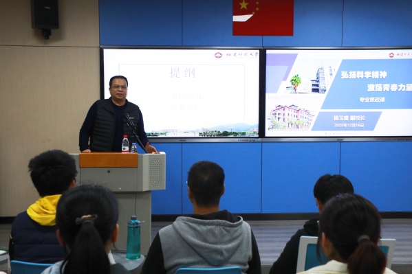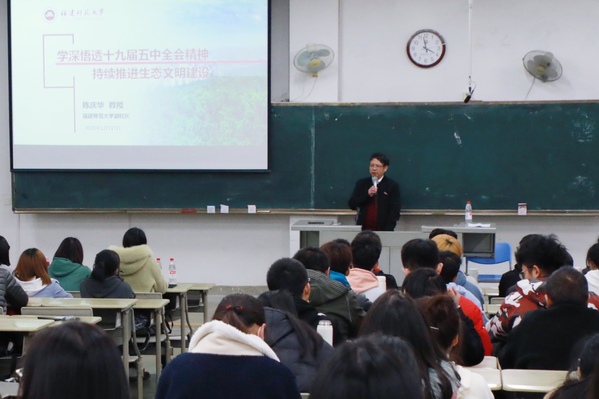 2020年12月18日,副校长杨玉盛以《弘扬科学精神 激荡青春力量》为题,为地理科学学院学生上思政课。他结合习近平总书记在第七十五届联合国大会上发表的重要讲话,围绕“全球气候变化与中国‘3060’目标”,向同学们阐释中国在全球气候变化议题中所展现的大国形象,希望同学们将专业学习与科学研究融入国家发展的历史机遇中,树立远大理想,致力知行合一,努力为应对全球气候变化战略贡献青年力量。