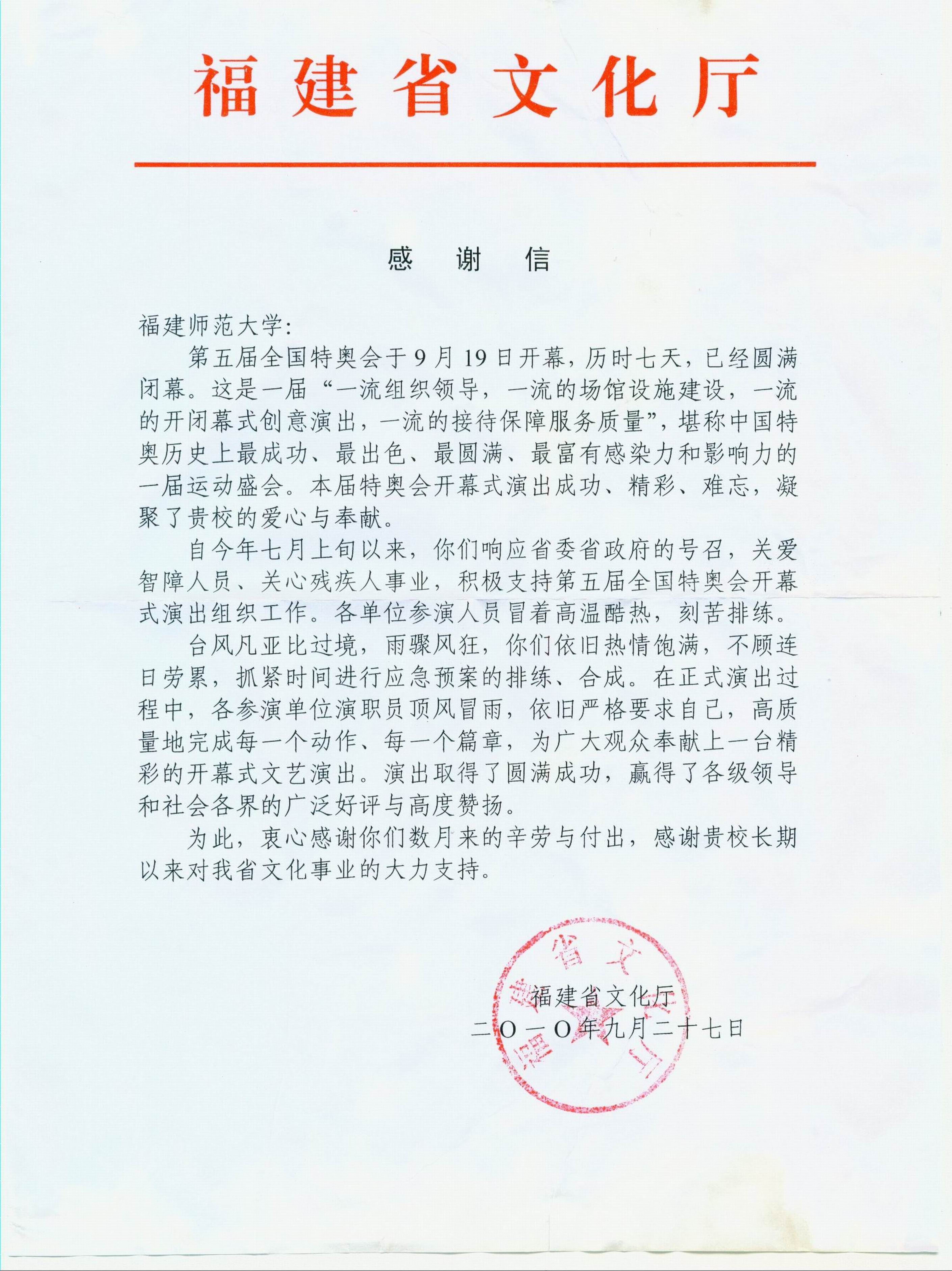 福建省文化厅致U8·电子(中国)官方网站感谢信