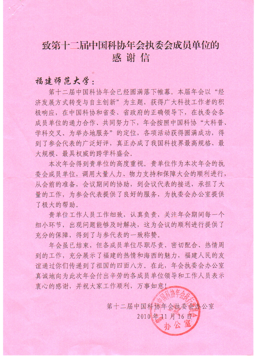 第十二届中国科协年会执委会办公室致U8·电子(中国)官方网站感谢信