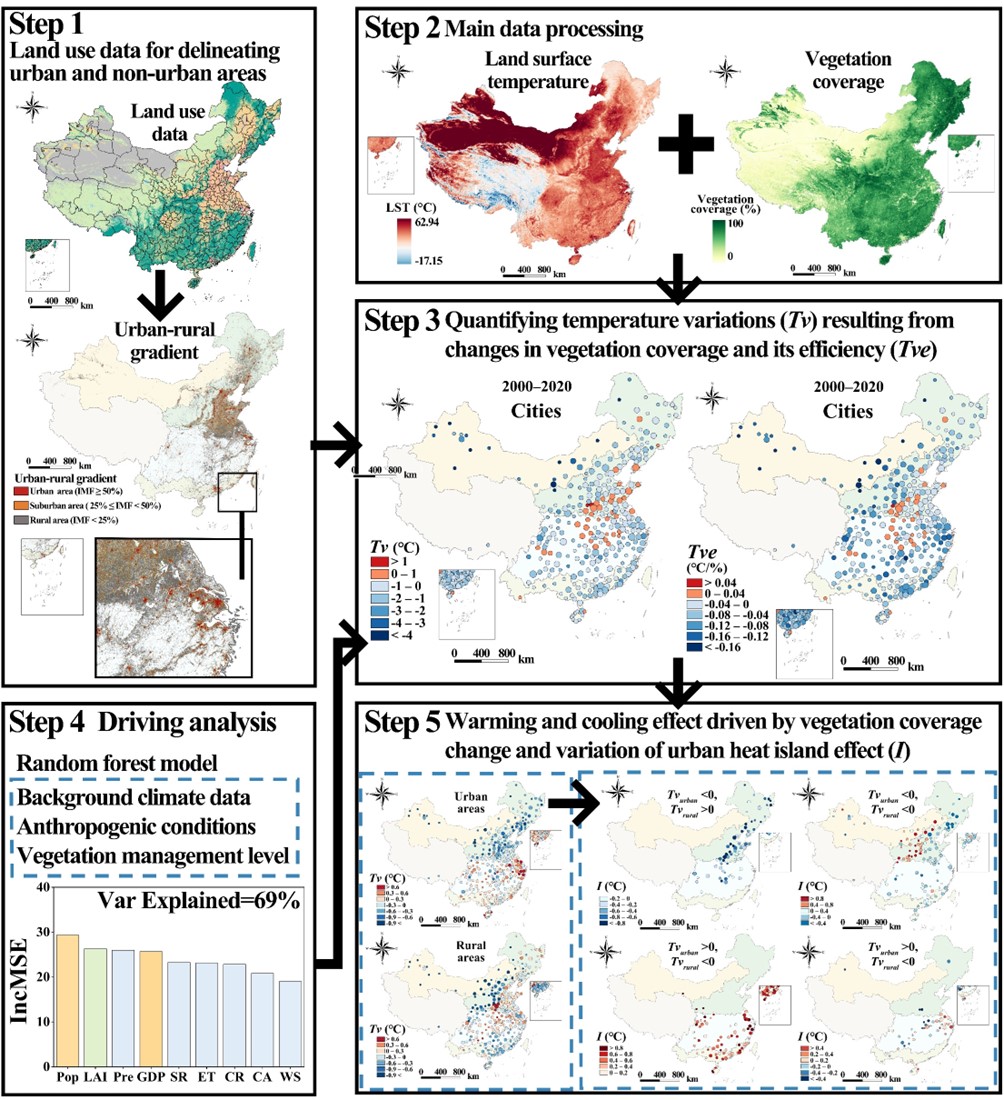 U8·电子(中国)官方网站地理科学学院、碳中和未来技术学院环境经济地理与气候变化应对创新研究团队在地理科学与城乡规划领域国际顶级期刊《Sustainable Cities and Society》发表了题为“Mitigation of urban heat island in China (2000–2020) through vegetation-induced cooling”的研究成果。研究利用多源卫星数据,探讨了中国城市植被覆盖变化对地表的响应关系,揭示了城市绿化对缓解城市热岛效应的重要作用。