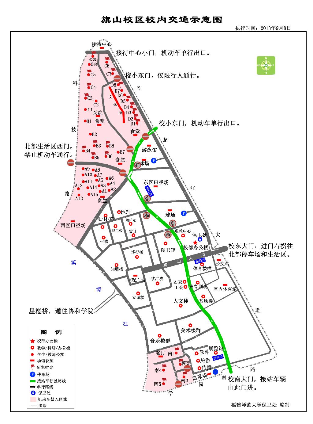 4.禁止机动车辆进入学生宿舍区域,工作车辆在不影响交通秩序的前提下凭校保卫处发放的临时通行证通行;旗山校区迎新相关单位工作车辆临时通行证于9月7日前到旗山校区保卫处交通科领取。