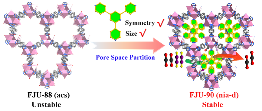 由化学与材料学院张章静研究员和项生昌研究员带领的多孔能源材料团队与美国Texas大学的Banglin Chen教授,在石化气体存储与分离领域的合作取得了重要进展,有关研究成果“孔空间分割型MOF实现C2H2/CO2的高效分离”(Pore Space Partition within a Metal−Organic Framework for Highly Efficient C2H2/CO2 Separation)于近日在国际化学材料学期刊《美国化学会志》(SCI一区,影响因子:14.357)上发表,该论文的第一作者是化学与材料学院博士生叶应祥。
