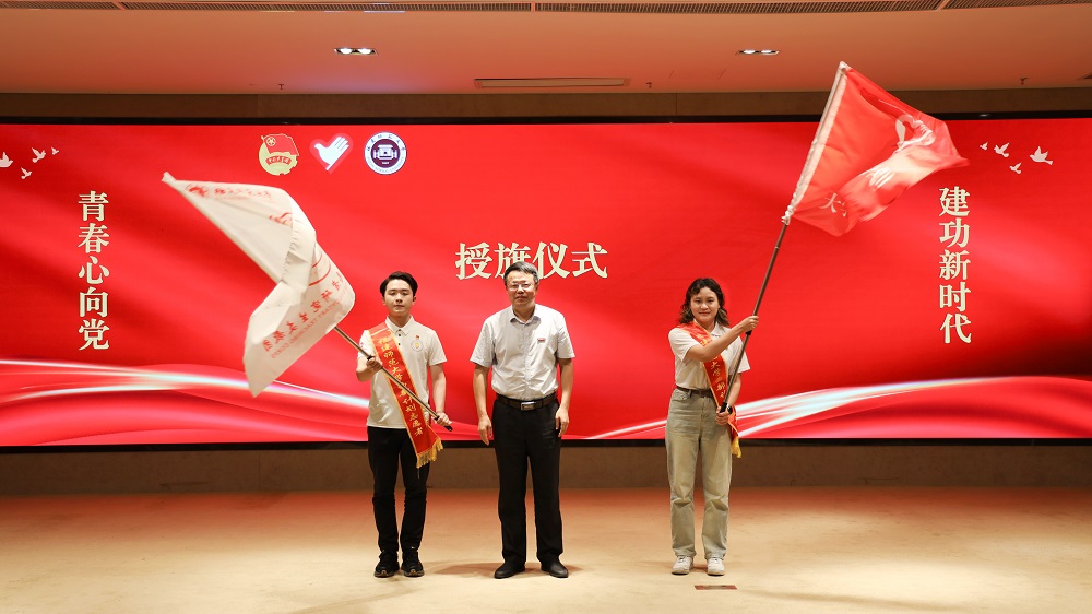 涂荣为西部计划志愿者颁发研究生支教团青马工程专项结业证书及毕业纪念章,潘玉腾为2022年西部计划志愿者代表授旗。