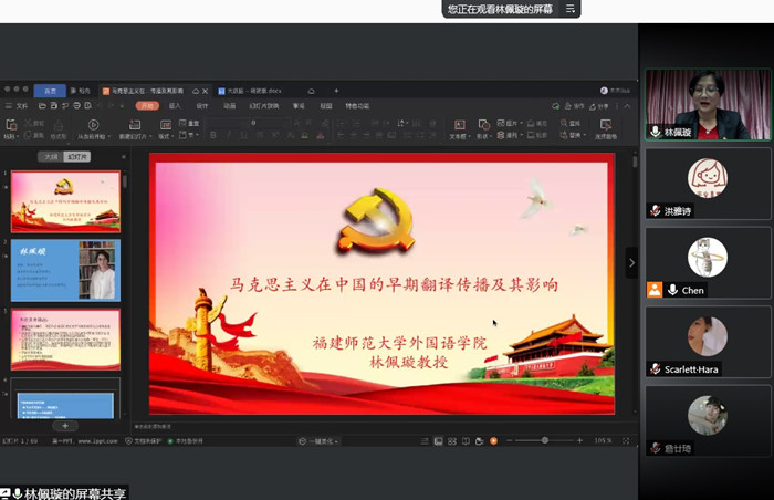 研究生邀请《红色翻译史》三卷本之“五四卷”主编、外国语学院教工第五党支部书记林佩璇教授作题为《马克思主义在中国的早期翻译传播及其影响》的线上讲座。讲座中,林佩璇教授将党史学习与翻译知识相结合,从翻译传播主体及典范翻译故事、翻译目的、具体内容、方式以及社会效度等方面介绍了马克思主义在中国的早期翻译传播的积极影响,并分享了自己多年来翻译研究与教学感悟。
