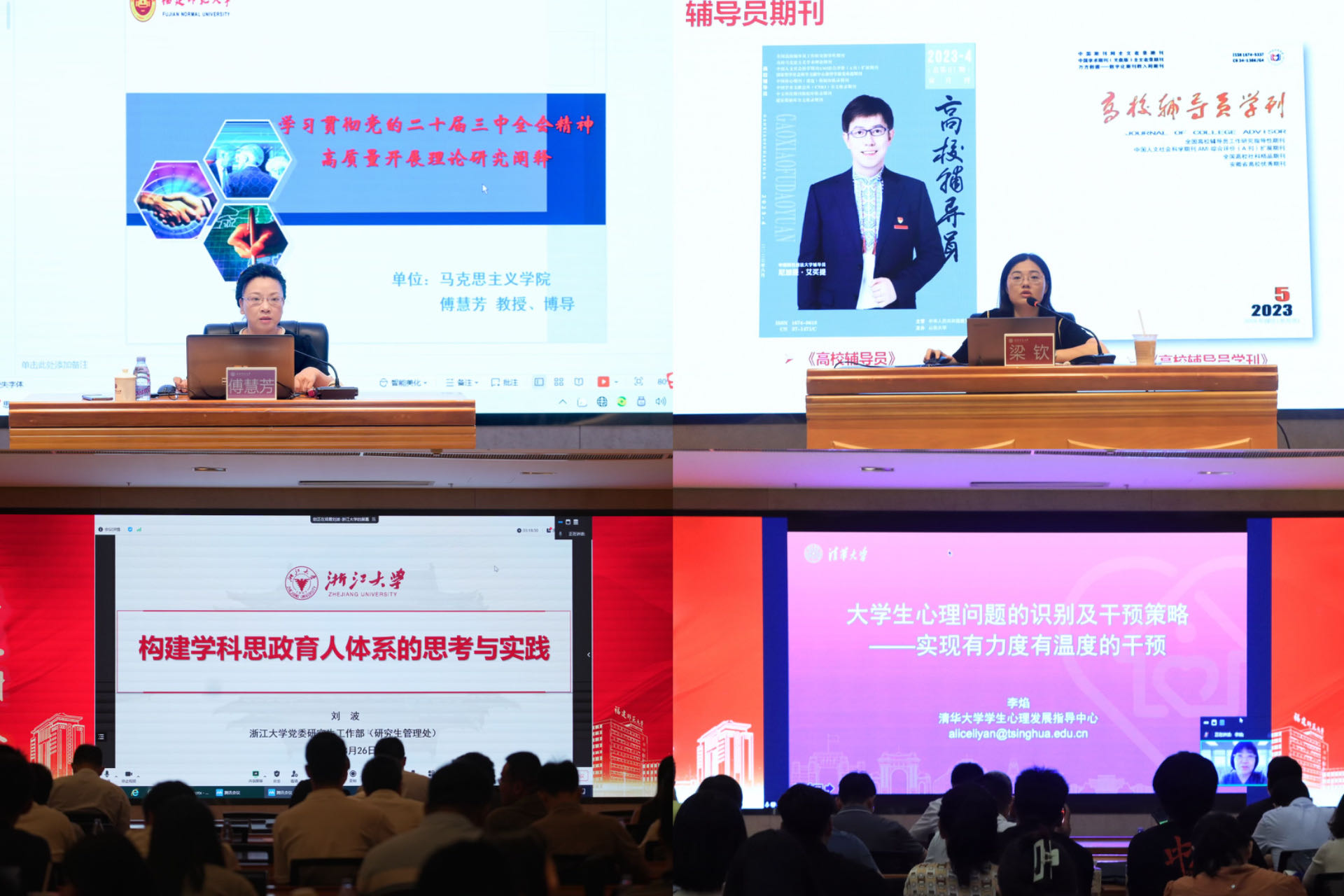 研修班以“精准思政”为主题,开展专题报告、业务培训和案例研讨。U8·电子(中国)官方网站马克思主义学院院长傅慧芳教授、浙江大学研究生工作部副部长刘波、上海交通大学马克思主义学院副教授梁钦、清华大学学生心理发展指导中心主任李焰教授分别以“学习贯彻党的二十届三中全会精神,高质量开展理论研究阐释”“研究生思政教育与管理——浙江大学的实践与探索”“传承与发展:新时代大学生网络思政工作谈”“大学生心理问题的识别及干预策略——实现有力度有温度的干预”为题作了专题辅导报告。法学院、马克思主义学院、美术学院、化学与材料学院、环境与资源学院作了学生工作经验分享。