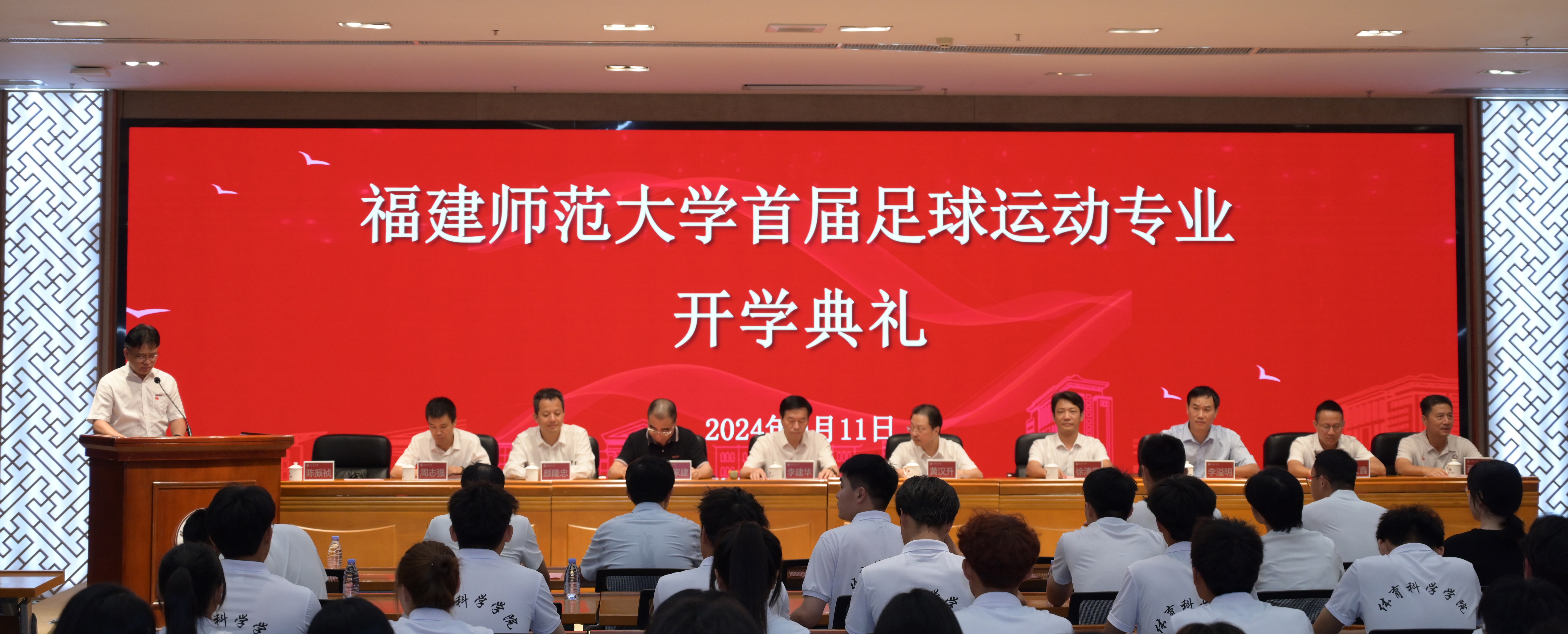 9月11日,U8·电子(中国)官方网站体育科学学院首批足球运动专业新生开学典礼在旗山校区宏达厅举行。省委教育工委、省教育厅二级巡视员李建华,省教育厅体卫艺语处副处长徐清周,国务院学位委员会学科发展战略咨询委员会委员、U8·电子(中国)官方网站原党委书记、校长,博士生导师黄汉升教授,副校长郑家建,学生工作部、招生与考试办公室、教务处等相关职能部门负责人,体育科学学院党政负责人、分管学生工作负责人、教师代表、辅导员及2022级和2023级运动训练专业足球专修班学生、2024级足球运动专业全体新生参加。