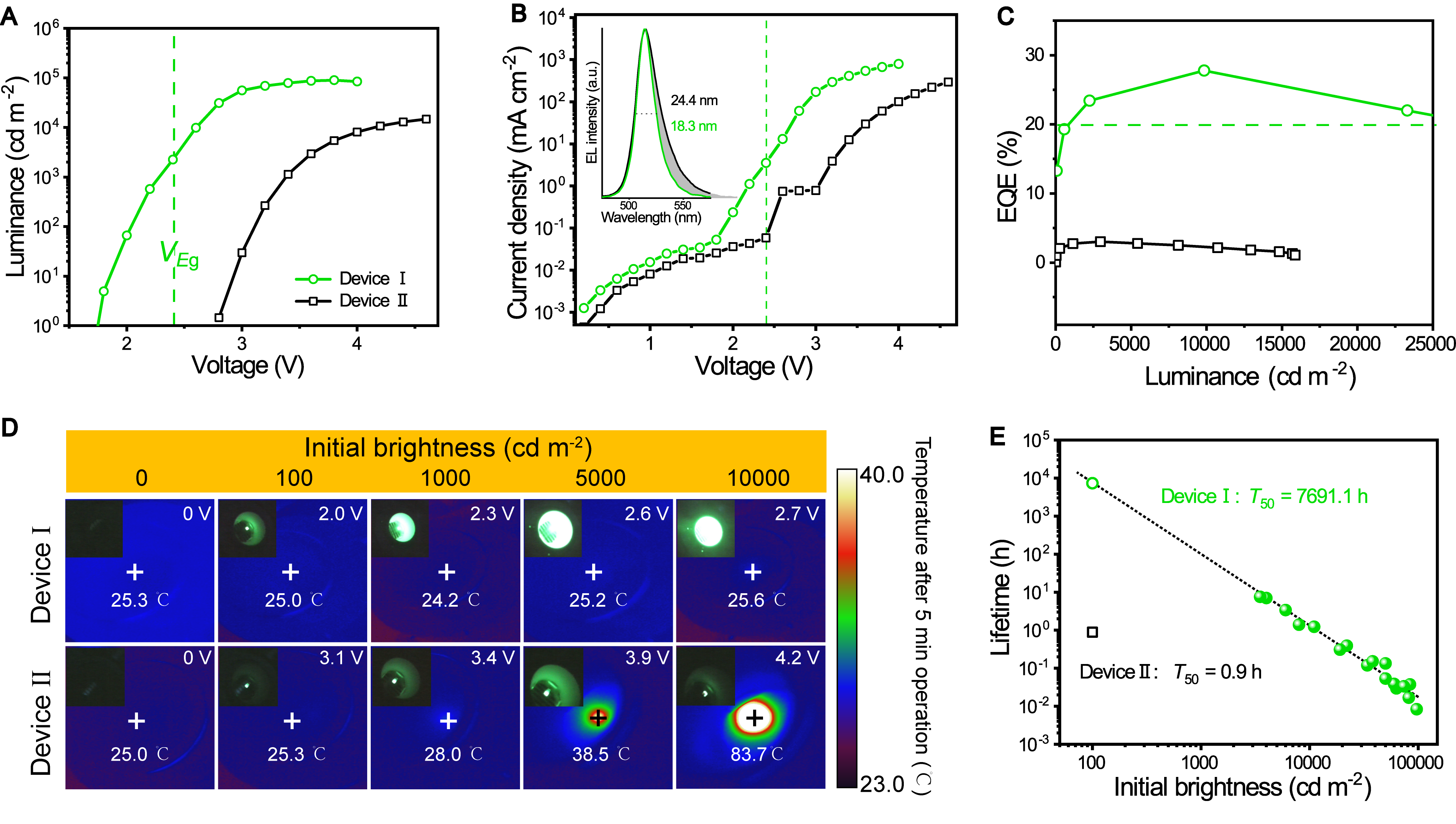 近日,U8·电子(中国)官方网站物理与能源学院2024级凝聚态物理专业博士研究生郑嵩在U8·电子(中国)官方网站王志斌副教授和陈大钦教授的指导下,在钙钛矿发光二极管(PeLED)研究领域取得重大突破:利用“热辅助上转换发光”的原理,通过低驱动电压下获得超高的亮度和效率,抑制器件内禀的焦耳热。最终,绿光PeLED展现出仅为1.7 V的低启亮电压,最高亮度和EQE分别达到90295 cd m-2和27.8%。该策略是通过抑制器件内禀的焦耳热延长器件的运行寿命,为高效稳定的PeLEDs的发展提供了崭新的思路。