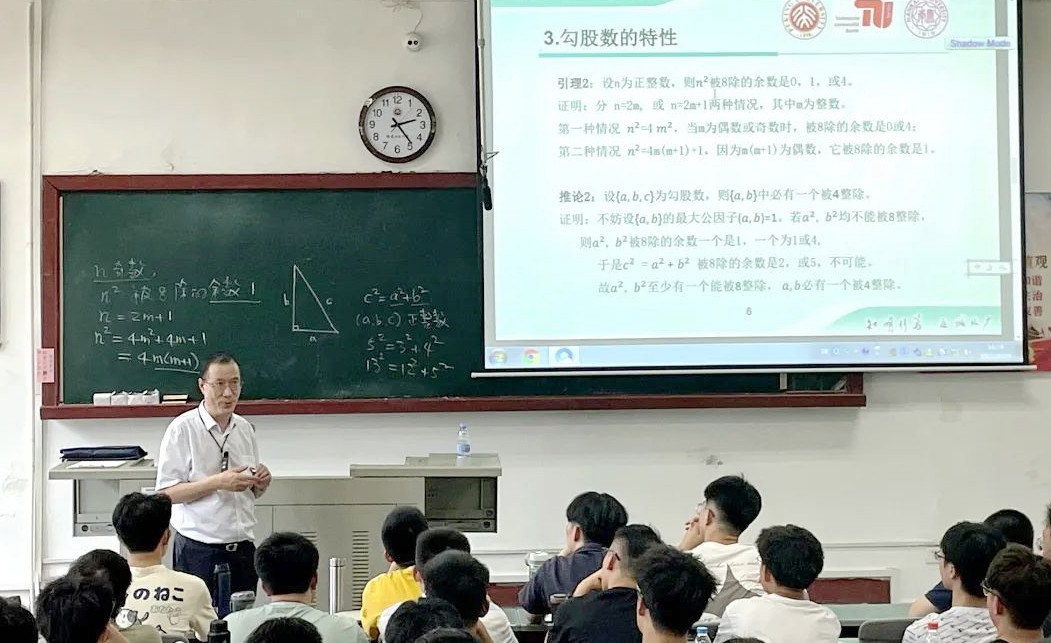 王长平校长讲授了《勾股数》和《多面体的欧拉公式》两个专题课。在《勾股数》一课中,他结合数论相关知识,循循善诱、步步推进,直至找到确定所有勾股数的方法,让同学们更加深刻地理解到勾股数的特性;在《多面体的欧拉公式》一课中,他引导同学们在形形色色的多面体中找到其中的规律,探索出顶点、棱、面三者在数量上的联系,从而强调了数学思维的重要性。