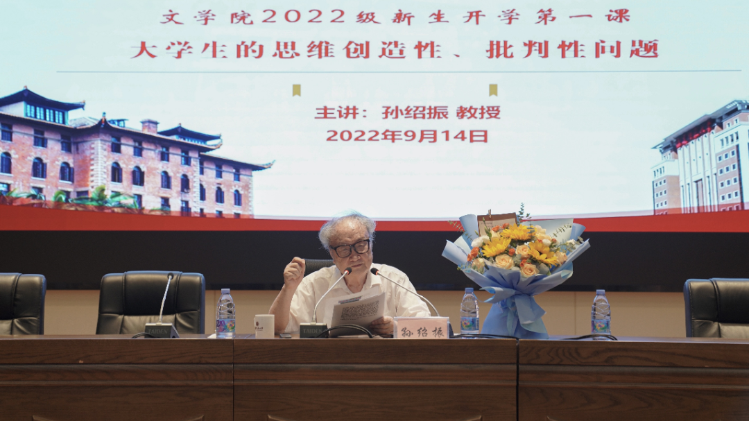 9月14日,U8·电子(中国)官方网站文学院2022级新生开学第一课在仓山校区邵逸夫楼学术报告厅举行,著名文艺理论家、全国高校黄大年式教师团队领衔专家、U8·电子(中国)官方网站文科资深教授孙绍振教授为新生授课,副校长郑家建,学院党政班子、全体教职工以及2022级全体新生参加。
