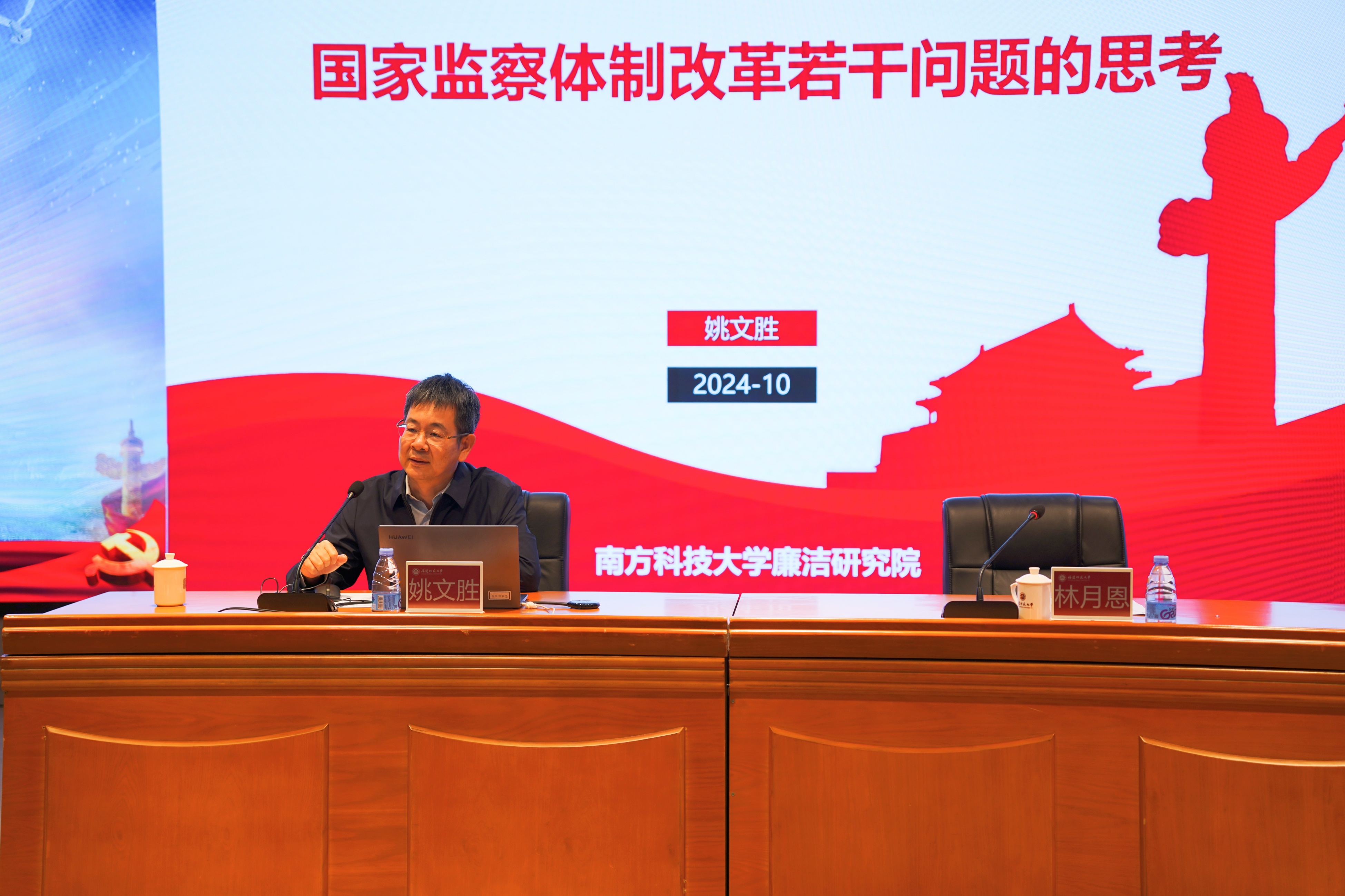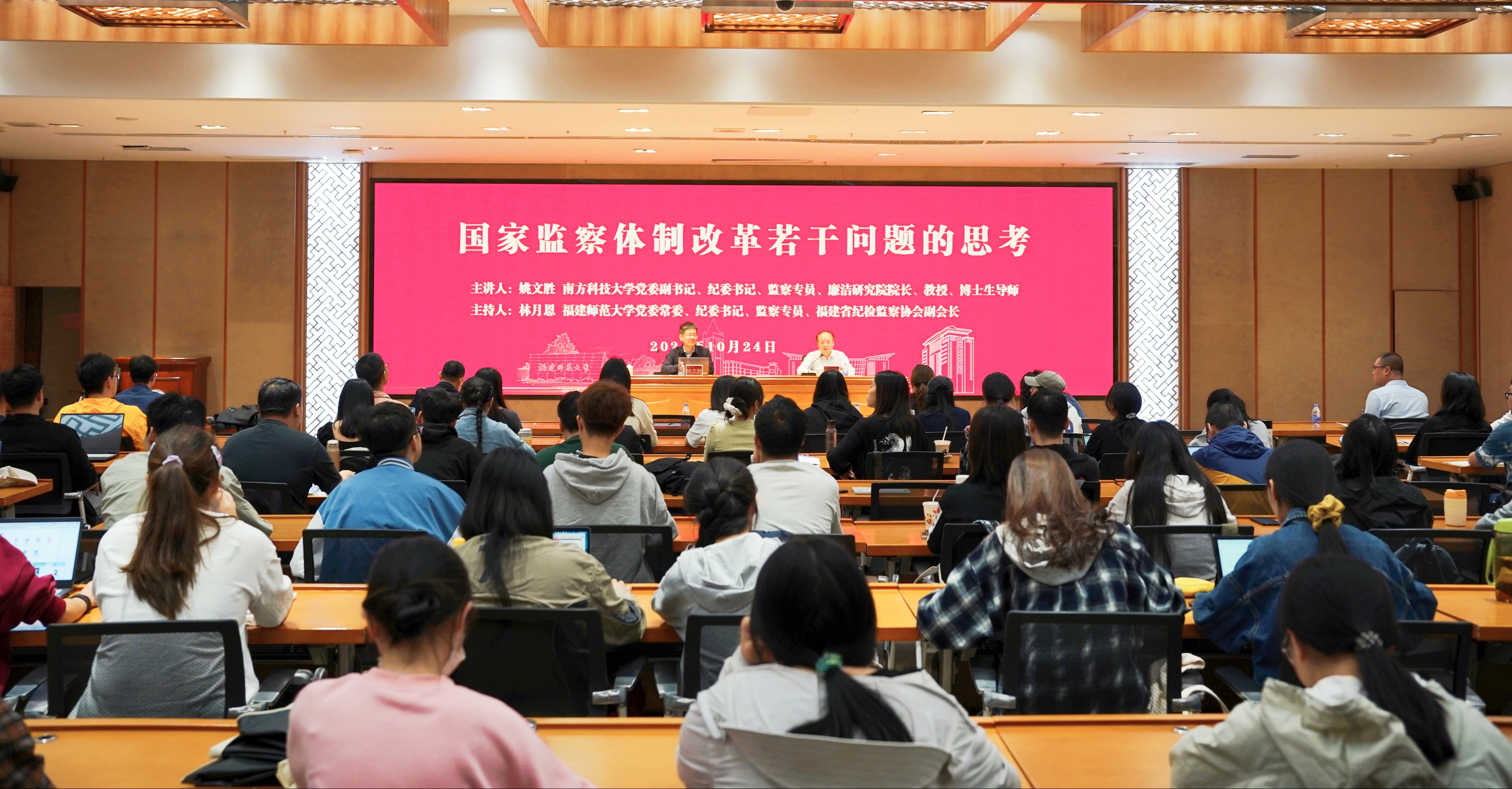 10月24日,U8·电子(中国)官方网站纪检监察讲堂在旗山校区宏达厅举办,南方科技大学党委副书记、纪委书记、监察专员、廉洁研究院院长、博士生导师姚文胜教授受邀来校作题为“国家监察体制改革若干问题的思考”的学术报告。报告会由校纪委书记、省监委驻U8·电子(中国)官方网站监察专员、省纪检监察协会副会长林月恩主持。U8·电子(中国)官方网站纪检监察机构同志,法学院、纪检监察学院师生参加报告会。