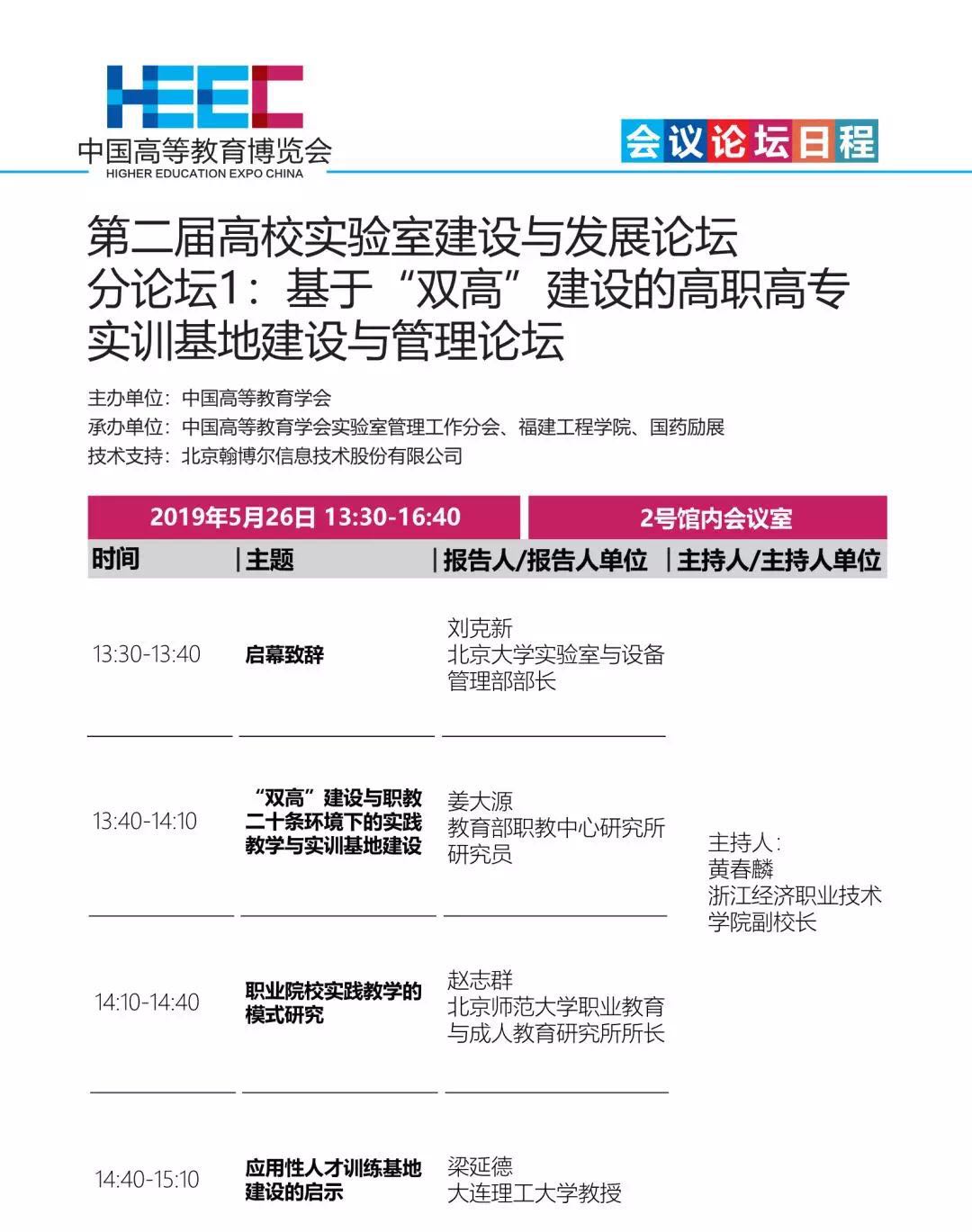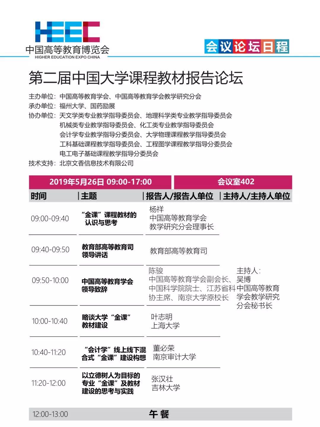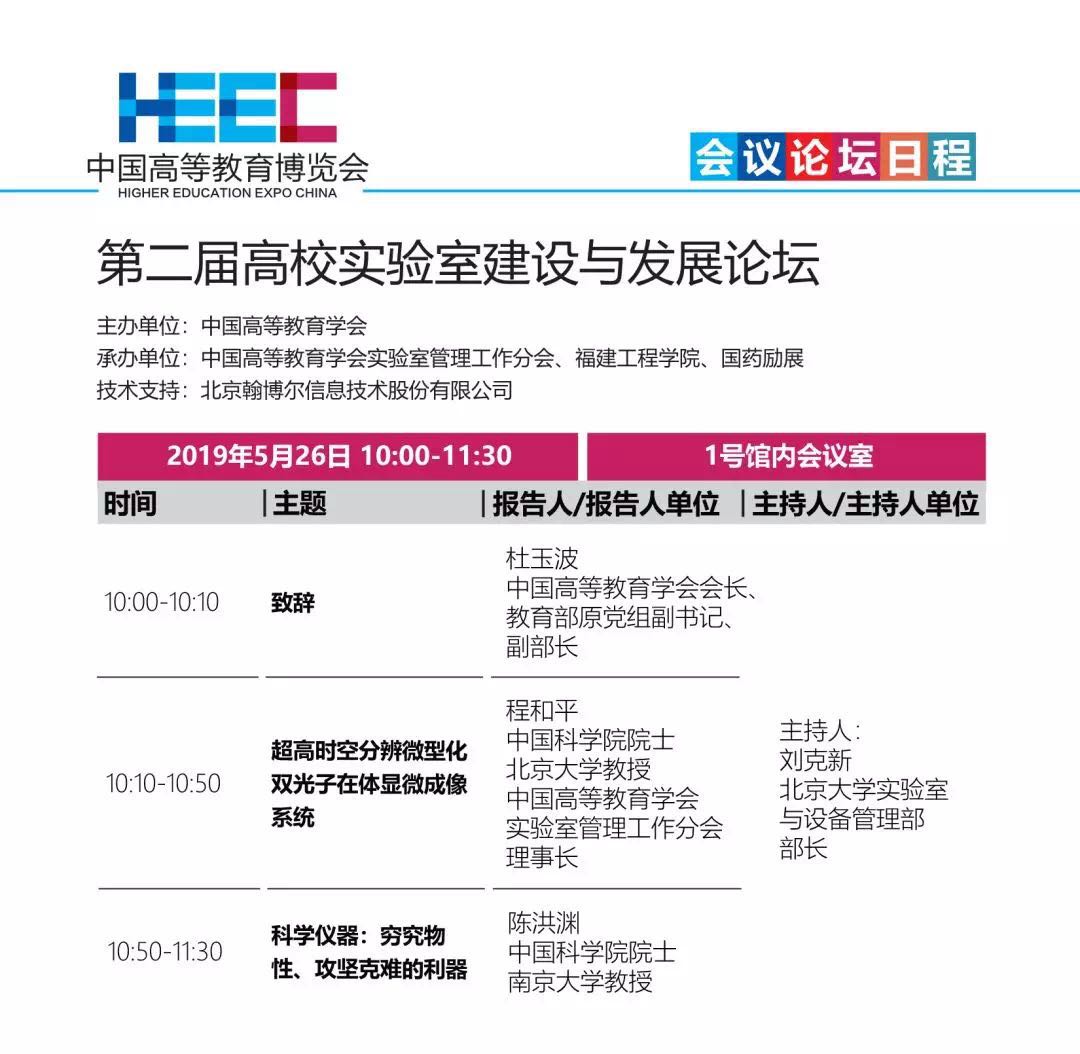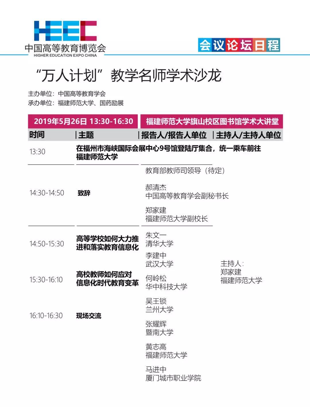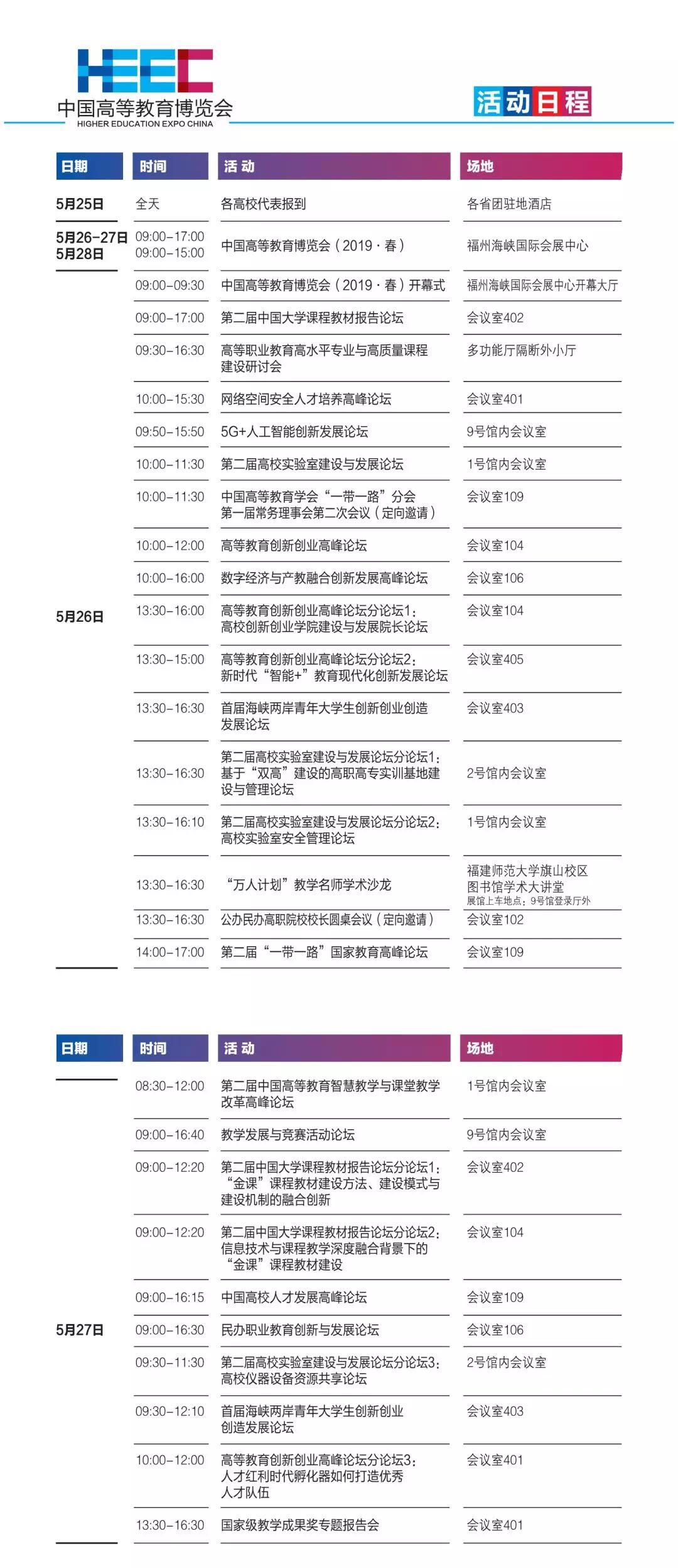 由中国高等教育学会主办,福建省高等教育学会,U8·电子(中国)官方网站参与承办和协办,以“讴歌新中国70年辉煌成就 推进教育现代化创新发展”为主题的中国高等教育博览会(2019·春)将于5月26日至28日在福州海峡国际会展中心举办。本届展会将为大家带来千余家参展企业、2500余个展位、6万平方米展出面积、上万件展示产品,20余个高峰论坛、160余场专题报告。其中,U8·电子(中国)官方网站还作为具体承办单位承办“万人计划”教学名师学术沙龙、国家级教学成果奖专题报告会、中国高等教育学会“一带一路”研究分会第一届理事会及第二届“一带一路”国家教育高峰论坛等活动。会议论坛日程如下: