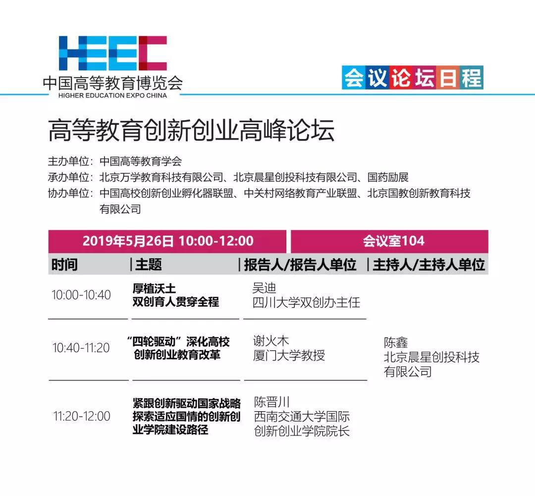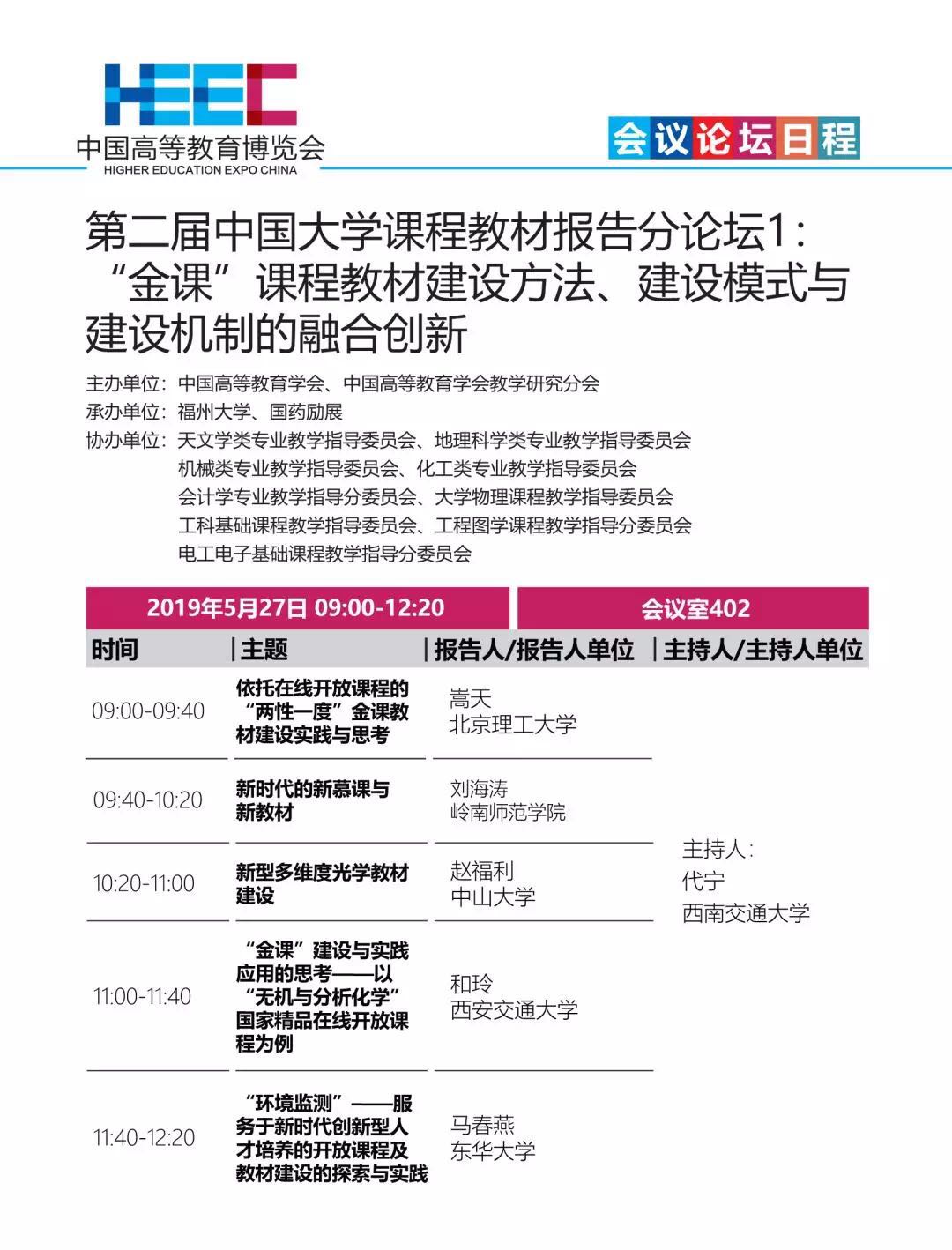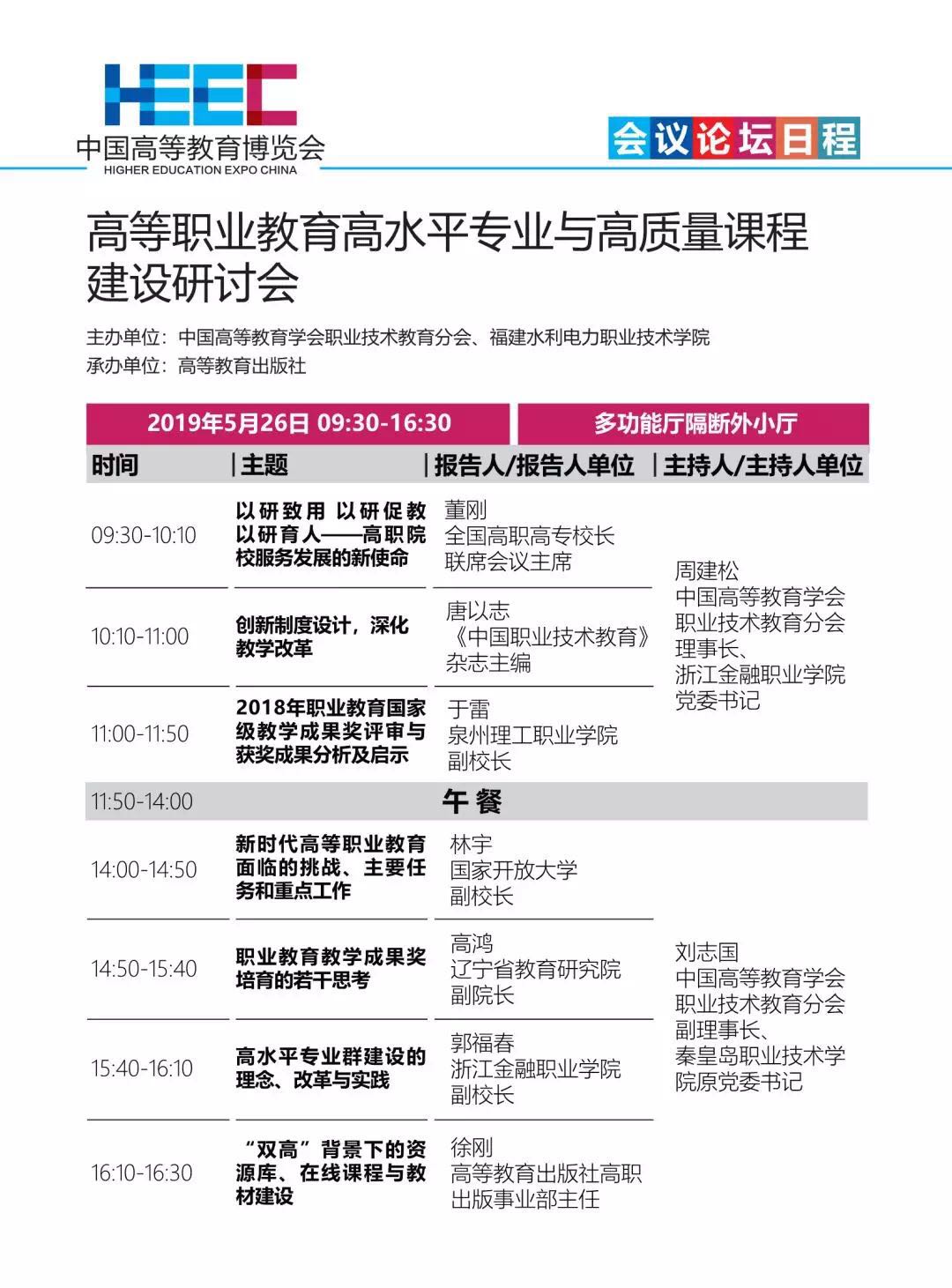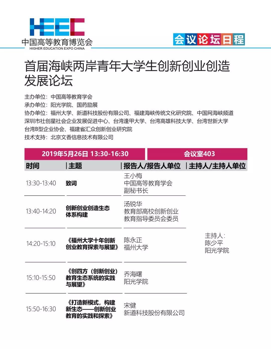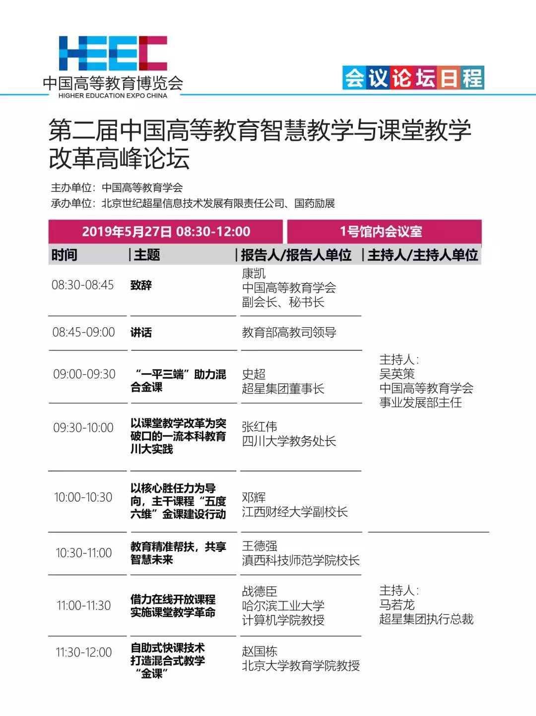 由中国高等教育学会主办,福建省高等教育学会,U8·电子(中国)官方网站参与承办和协办,以“讴歌新中国70年辉煌成就 推进教育现代化创新发展”为主题的中国高等教育博览会(2019·春)将于5月26日至28日在福州海峡国际会展中心举办。本届展会将为大家带来千余家参展企业、2500余个展位、6万平方米展出面积、上万件展示产品,20余个高峰论坛、160余场专题报告。其中,U8·电子(中国)官方网站还作为具体承办单位承办“万人计划”教学名师学术沙龙、国家级教学成果奖专题报告会、中国高等教育学会“一带一路”研究分会第一届理事会及第二届“一带一路”国家教育高峰论坛等活动。会议论坛日程如下: