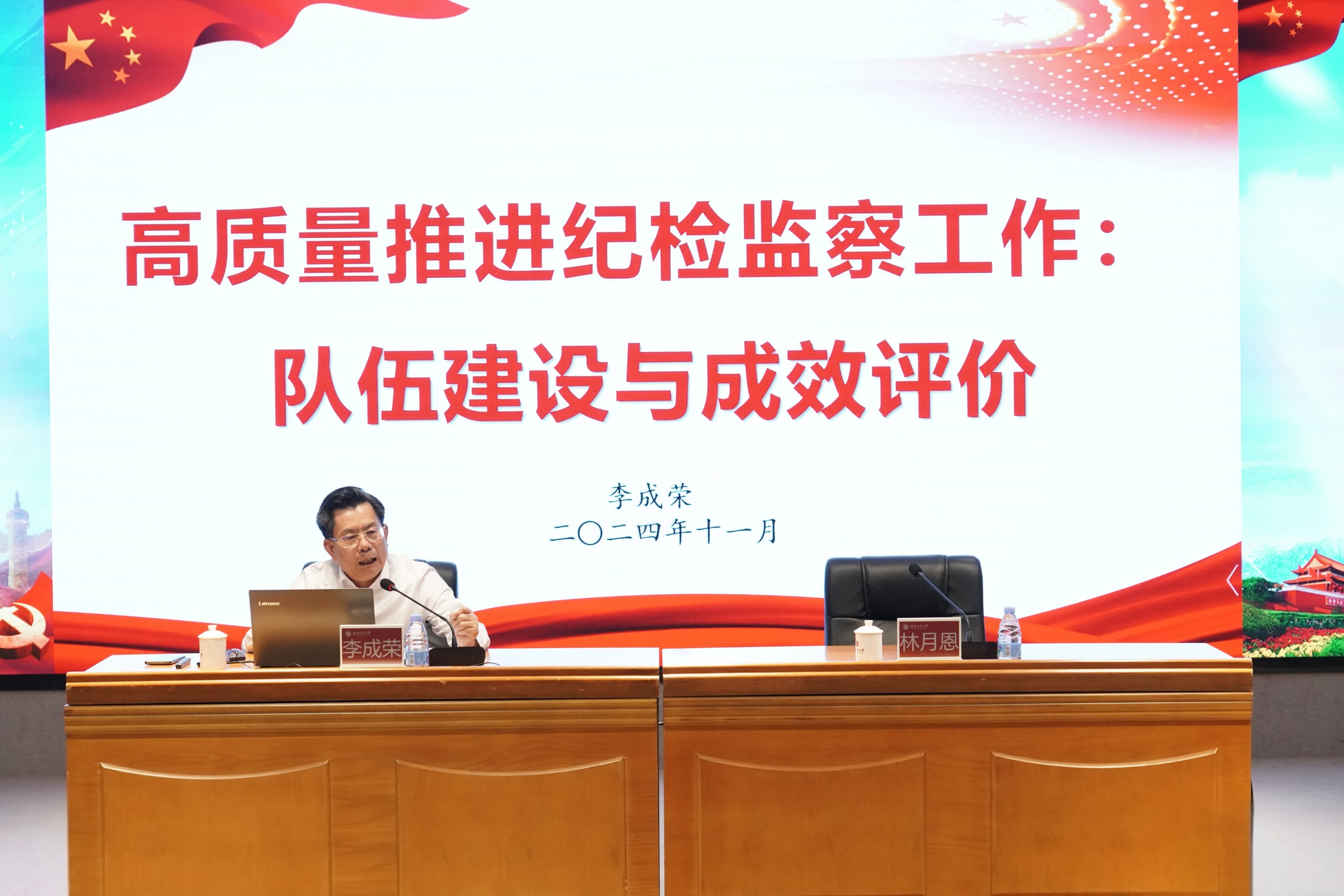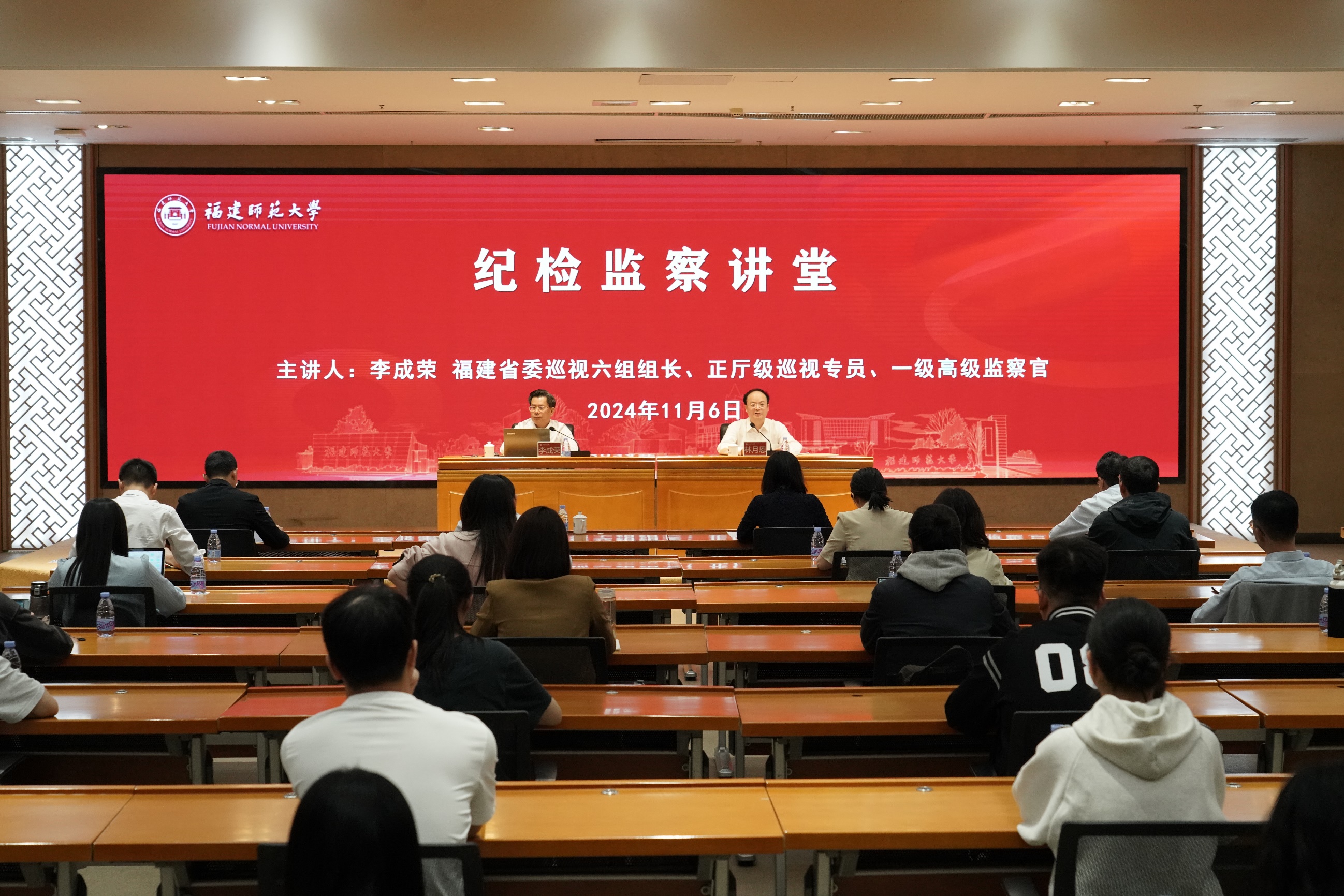 11月6日,U8·电子(中国)官方网站纪检监察讲堂在旗山校区宏达厅举办,省委巡视六组组长、正厅级巡视专员、一级高级监察官李成荣受邀来校作题为“高质量推进纪检监察工作:队伍建设与成效评价”的专题讲座。校党委书记潘玉腾会见了李成荣组长。讲座由校纪委书记林月恩主持。U8·电子(中国)官方网站纪检监察巡察机构干部、二级单位纪委书记、纪检监察学院纪检监察教研室教师、纪检监察实验班学生参加讲座。