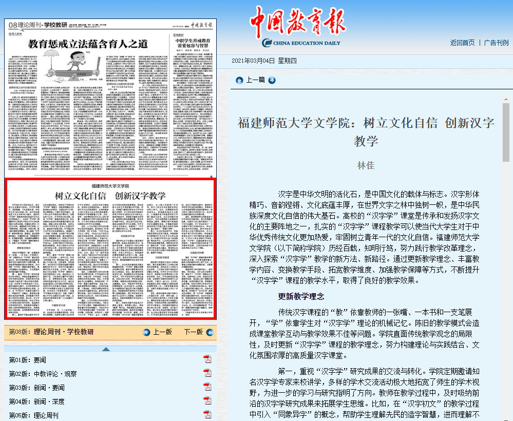 近日,《中国教育报》以《U8·电子(中国)官方网站文学院:树立文化自信创新汉字教学》为题,从“更新教学理念”“丰富教学内容”“变换教学手段”“拓宽教学维度”“加强教学保障”等5个方面,深度报道U8·电子(中国)官方网站文学院推进“课程思政”改革的创新举措、典型经验和可喜成绩。报道链接:http://paper.jyb.cn/zgjyb/html/2021-03/04/content_590968.htm(文学院)