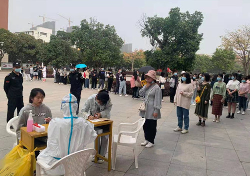 在检测现场,学工部、保卫处、各学院工作人员共同维持秩序,引导学生戴好口罩、保持距离,分批次有序前往检测点排队、登记、采样;同学们积极服从安排、听从指挥、全力配合医护人员的采样工作。