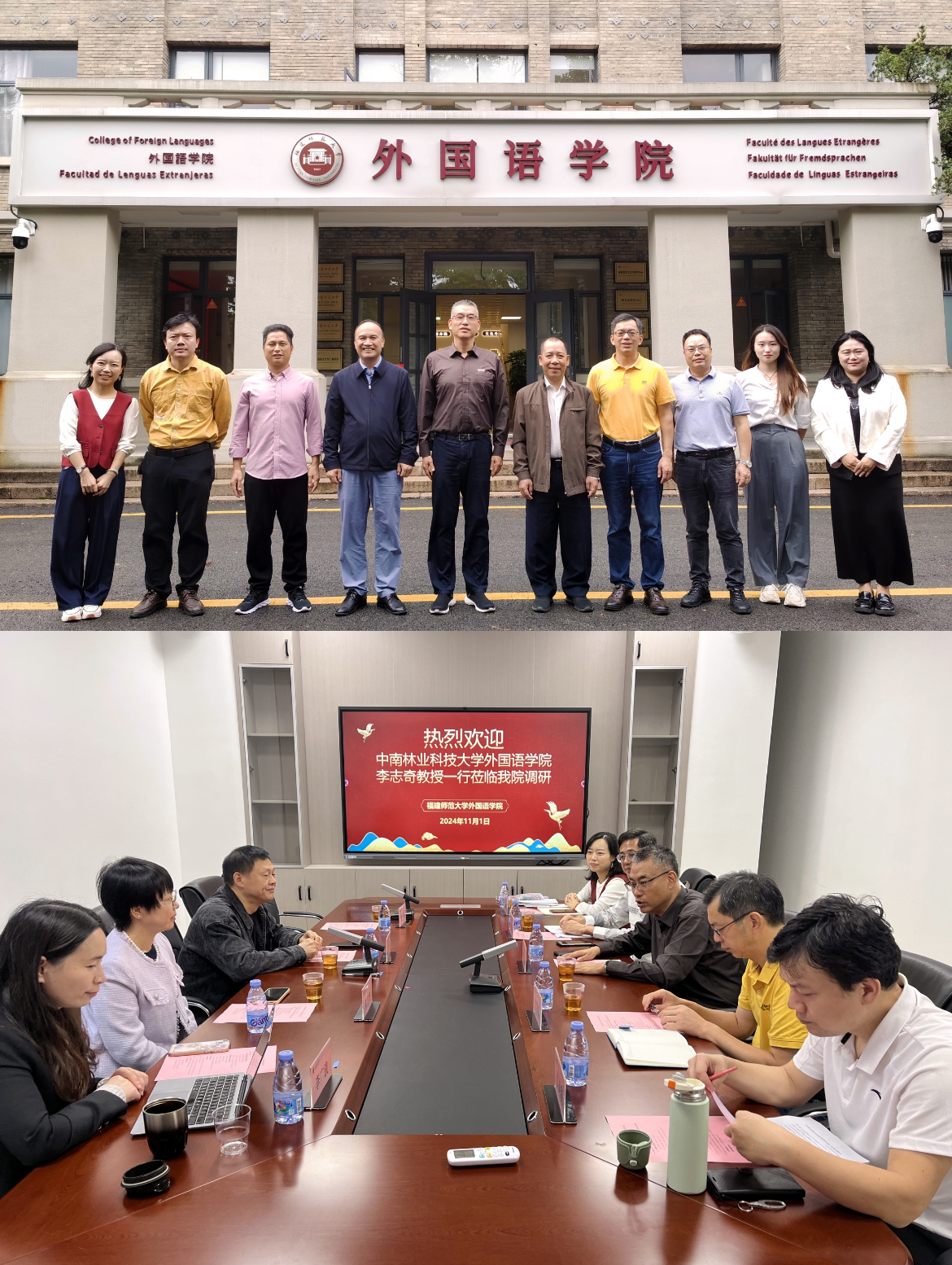 近日,中南林业科技大学外国语学院翻译系学科带头人李志奇教授、翻译系主任李广践副教授一行,广西师范大学外国语学院党委书记江飞、副院长刘明录一行到外国语学院调研交流。学院党委书记林鲁文、副书记肖良建、副院长尤泽顺以及相关老师参加调研。会上,双方就党建工作、课程设置、教学管理、教学效果评估、人才培养特色、学风建设等方面展开讨论。双方均表示,今后要加强联系,互通有无,在服务国家基础教育等方面交流共进。(外国语学院)