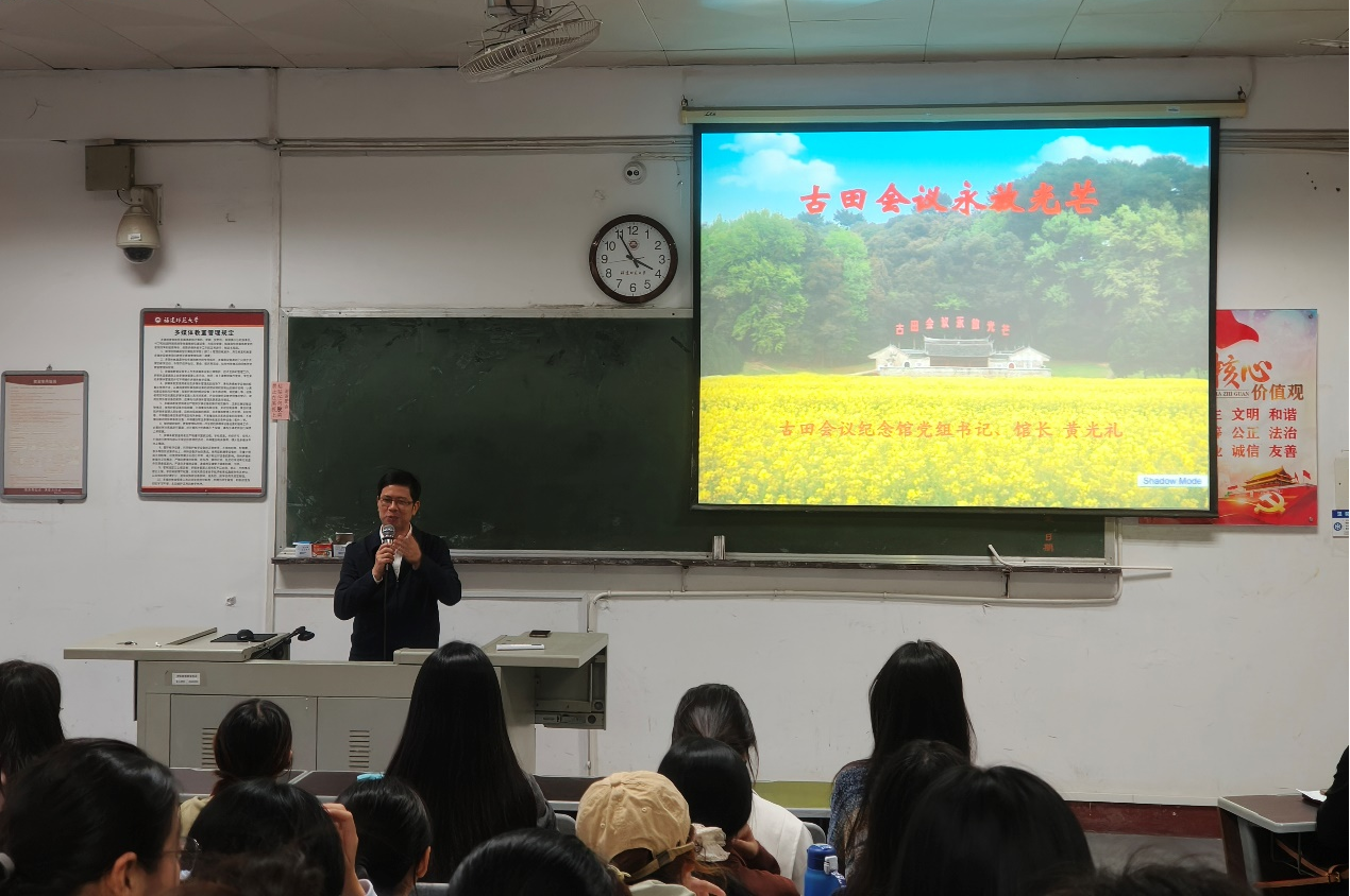 讲座上,黄光礼结合详实的史料和鲜活的革命历史故事,以及古田会议纪念馆珍藏收集的文物照片,向同学们讲述了古田会议的历史背景和历史贡献、古田会议精神的基本内涵及启示。他鼓励同学们新时期要继续弘扬古田会议精神,传承红色基因血脉,争做有理想、敢担当、能吃苦、肯奋斗的时代新人。