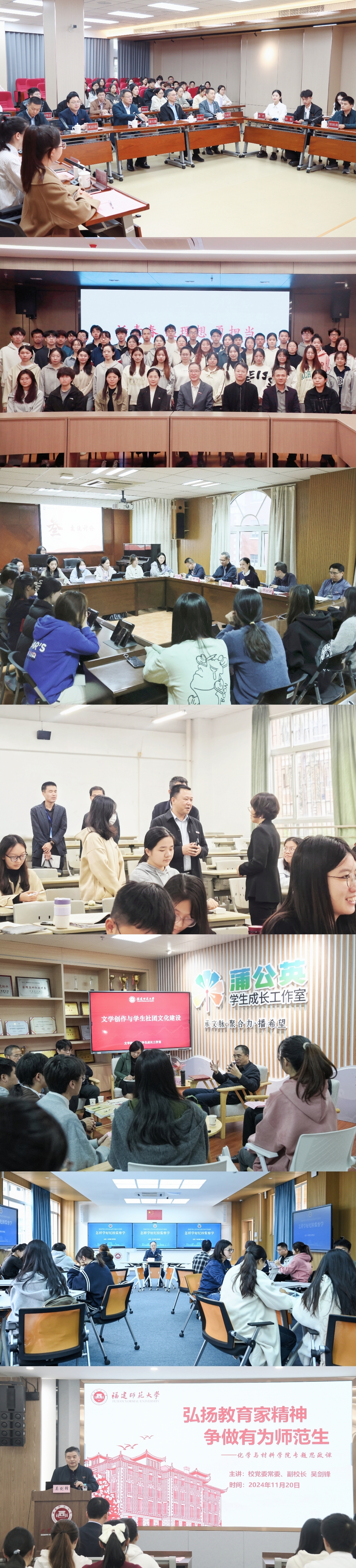 校党委书记潘玉腾走进马克思主义学院2023级思想政治教育专业二班和福建省习近平新时代中国特色社会主义思想大学生研习社(U8·电子(中国)官方网站),开展“凝心聚力担使命 知行合一强根基”主题座谈会;校长王长平参加数学与统计学院2023级数学实验班“话青春 谈理想 勇担当”主题班会,并为学生上思政课;校党委副书记陈晓红参加音乐学院2022级音乐学(国家人才培养基地)班“温暖·安全·成长”主题班会;校党委副书记涂荣深入经济学院2021级经济学(国家人才培养基地)班看望毕业班同学并随堂听课;副校长郑家建与文学院2022级汉语言文学(师范)五班及文学社师生代表开展“文学创作与师范生素质提升”主题座谈会;校纪委书记林月恩为法学院、纪检监察学院2022级纪检监察实验班同学们讲授“怎样学好纪检监察学”专题思政课;副校长吴剑锋为化学与材料学院2023级化学(师范)班学生讲授“弘扬教育家精神,争做有为师范生”专题思政课。