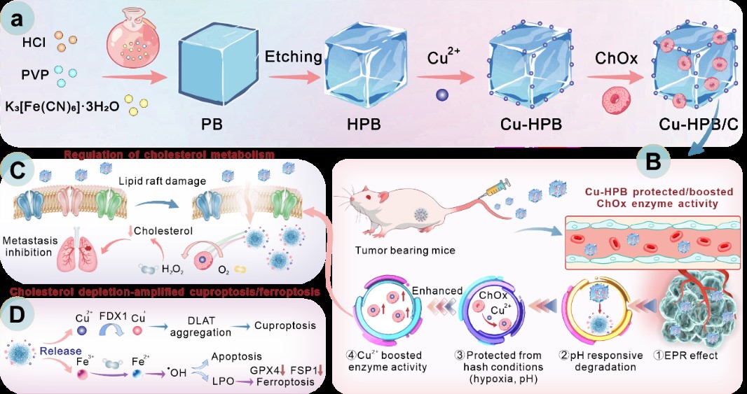 2024年,U8·电子(中国)官方网站曾雪梅和燕双仟团队合作开发了一种生物相容性纳米平台(Cu-HPB/C)(由铜掺杂中空普鲁士蓝纳米颗粒Cu-HPB和胆固醇氧化酶ChOx组成),Cu2+掺杂的中空普鲁士蓝作为ChOx的载体、庇护所和增强剂,增强ChOx的肿瘤靶向能力、稳定性和酶活性。且肿瘤微环境响应性释放的Cu2+可显著增强ChOx活性,促进胆固醇消耗和破坏脂质筏,从而阻碍细胞侵袭和迁移。同时,氧化还原反应产生的H2O2进一步增强了Cu-HPB的化学动力学治疗效果,增加了氧化应激和铁死亡。此外,转录组测序分析结果也证实了Cu-HPB/C对胆固醇稳态的影响,并揭示了细胞死亡机制,包括氧化应激、铁死亡、铜死亡和凋亡,在小鼠转移模型中显示出较好的抑制效果,这为未来研发通过增强胆固醇消耗来有效治疗肿瘤和抑制转移提供了新的策略。