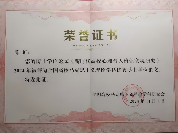 近日,由全国高校马克思主义理论学科研究会主办的第十七届全国高校马克思主义理论学科博导论坛在安徽大学举行马克思主义学院2017级博士研究生陈虹的学位论文《新时代高校心理育人价值实现研究》(指导教师:潘玉腾教授)获2024年度全国高校马克思主义理论学科优秀博士学位论文