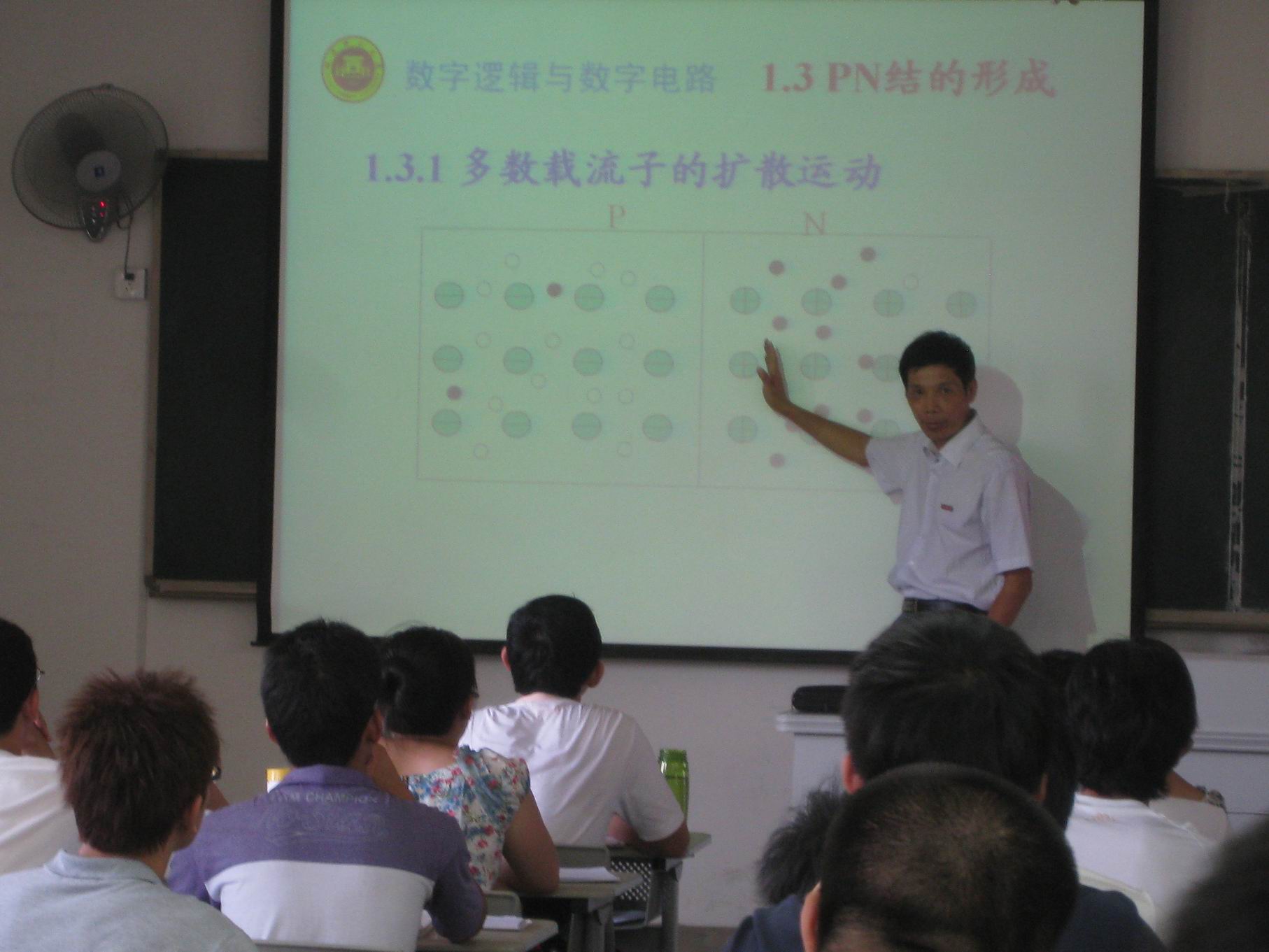 课堂上,蔡声镇教授首先引导学生对上一章内容进行总结,并熟练地应用PPT技术,用与课程内容密切相关又能激发学生学习兴趣的图片及注释,巧妙地引导学生进入本节课程内容——逻辑门电路基础。接下来,他采用形象的示意图和能够与教学内容同步展示的流程图,展示了半导体主要特性及其在日常生活中的应用,分析了本征半导体和杂质半导体的微观结构与宏观特性,在此基础上,对“PN结”的形成过程和“PN结”导电机理作了详细的分析与总结,较好地解决了“‘PN结’的微观结构决定其宏观特性”的教学难点,取得了较好的课堂教学效果。