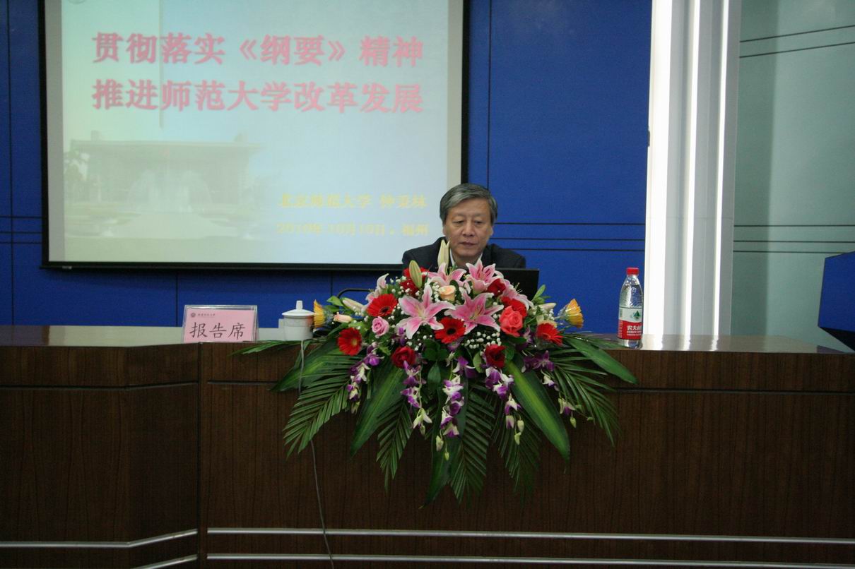 10月10日上午,U8·电子(中国)官方网站在仓山校区邵逸夫楼学术报告厅举行校院两级中心组(扩大)学习会,邀请北京师范大学校长钟秉林教授作题为“贯彻落实《纲要》精神 推进师范大学改革发展”的专题报告。校领导,全体处级干部(含校聘),各民主党派、统战团体、无党派人士联谊会负责人,离休党总支、关工委、退休协会、老年大学负责人,机关科级干部,各学院分党委(党总支)秘书、办公室主任参加了会议。学习会由黄汉升校长主持。