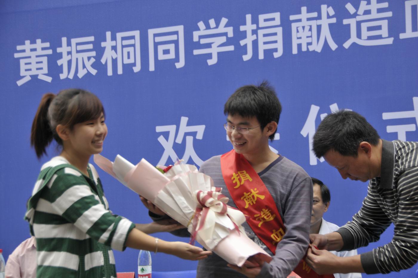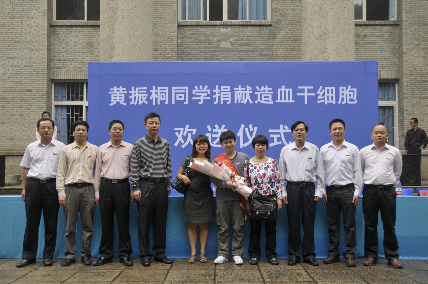 欢送仪式上,胡树林首先向大家介绍了黄振桐同学捐献造血干细胞的先进事迹,高度赞扬了黄振桐同学的高尚品德,并对学校及黄振桐家人的支持表示衷心的感谢。黄锦平宣读了表彰黄振桐同学的校长嘉奖令。校团委负责同志为黄振桐同学颁发了“优秀志愿者”荣誉证书。