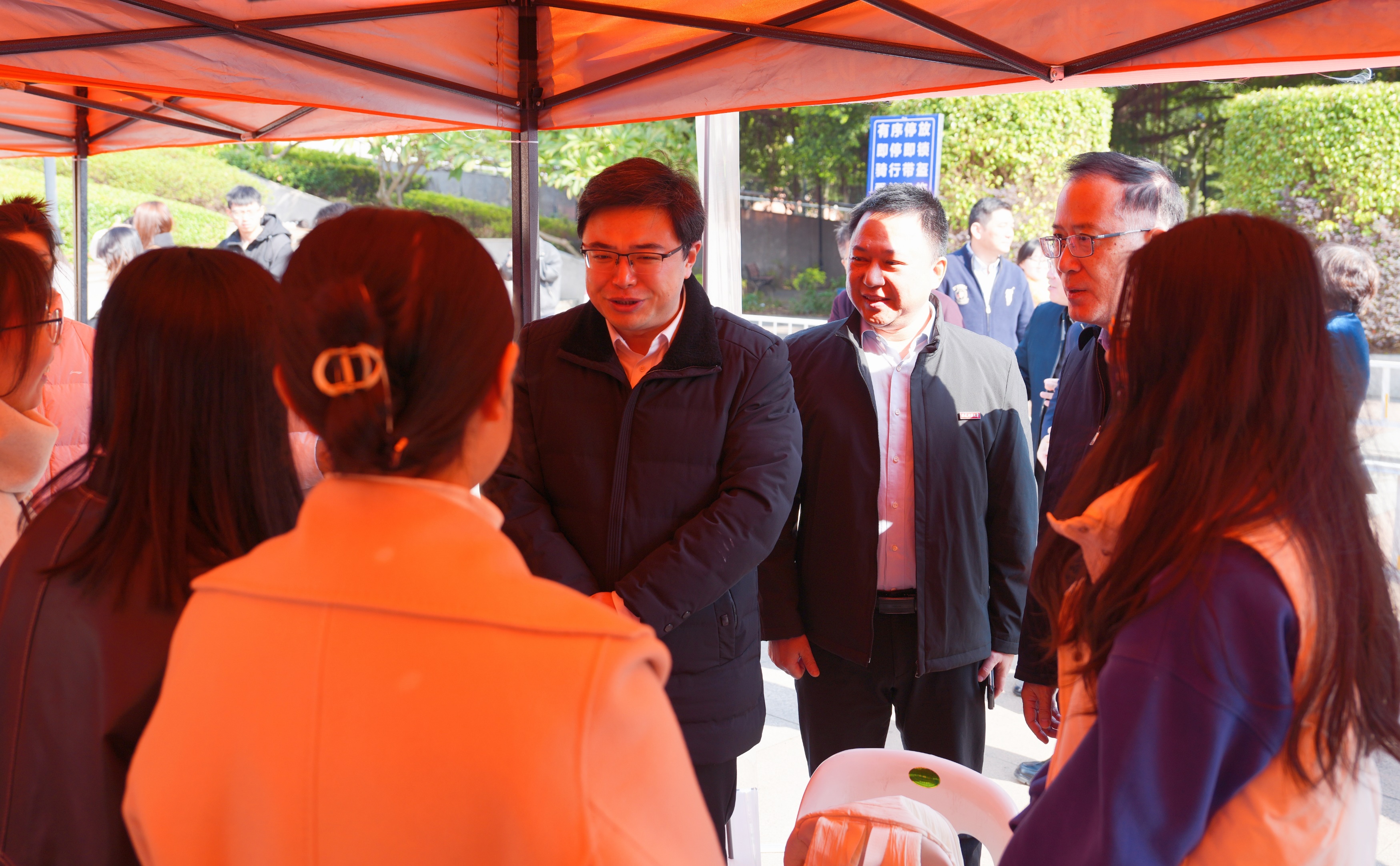 与会领导一同深入招聘会现场,与用人单位和参会毕业生交谈,询问了解企业发展现状、人才需求和现场招聘情况,鼓励毕业生积极求职,加力实现早就业、就好业。