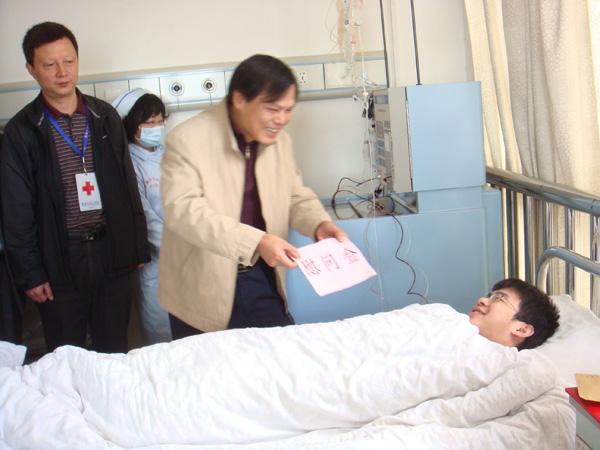 黄锦平代表学校向黄振桐同学送上鲜花和慰问金,表达了亲切的慰问,称赞黄振桐同学捐献造血干细胞的行为令人敬佩,是学校的骄傲。胡树林为黄振桐同学授予捐赠证书,并献上鲜花。信息技术学院林伟书记也代表学院送上鲜花和慰问金。黄振桐同学所在班级的同学给他送来花篮、水果和牛奶等,自入院以来,同学们轮流陪伴在他的身边。黄振桐同学神态轻松,非常感谢家人对他的支持和领导、老师、同学们对他的关心。