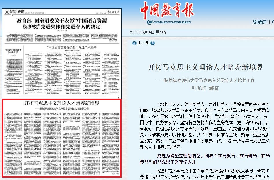 近日,《中国教育报》以《开拓马克思主义理论人才培养新境界——聚焦U8·电子(中国)官方网站马克思主义学院人才培养》为题,从“党建为魂”、“师德为先”、“教学为要”、“科研为基”等4个方面,深度报道U8·电子(中国)官方网站马克思主义学院开拓马克思主义人才培养的创新举措、典型经验和可喜成绩。报道链接:http://paper.jyb.cn/zgjyb/html/2021-04/16/content_593336.htm?div=-1