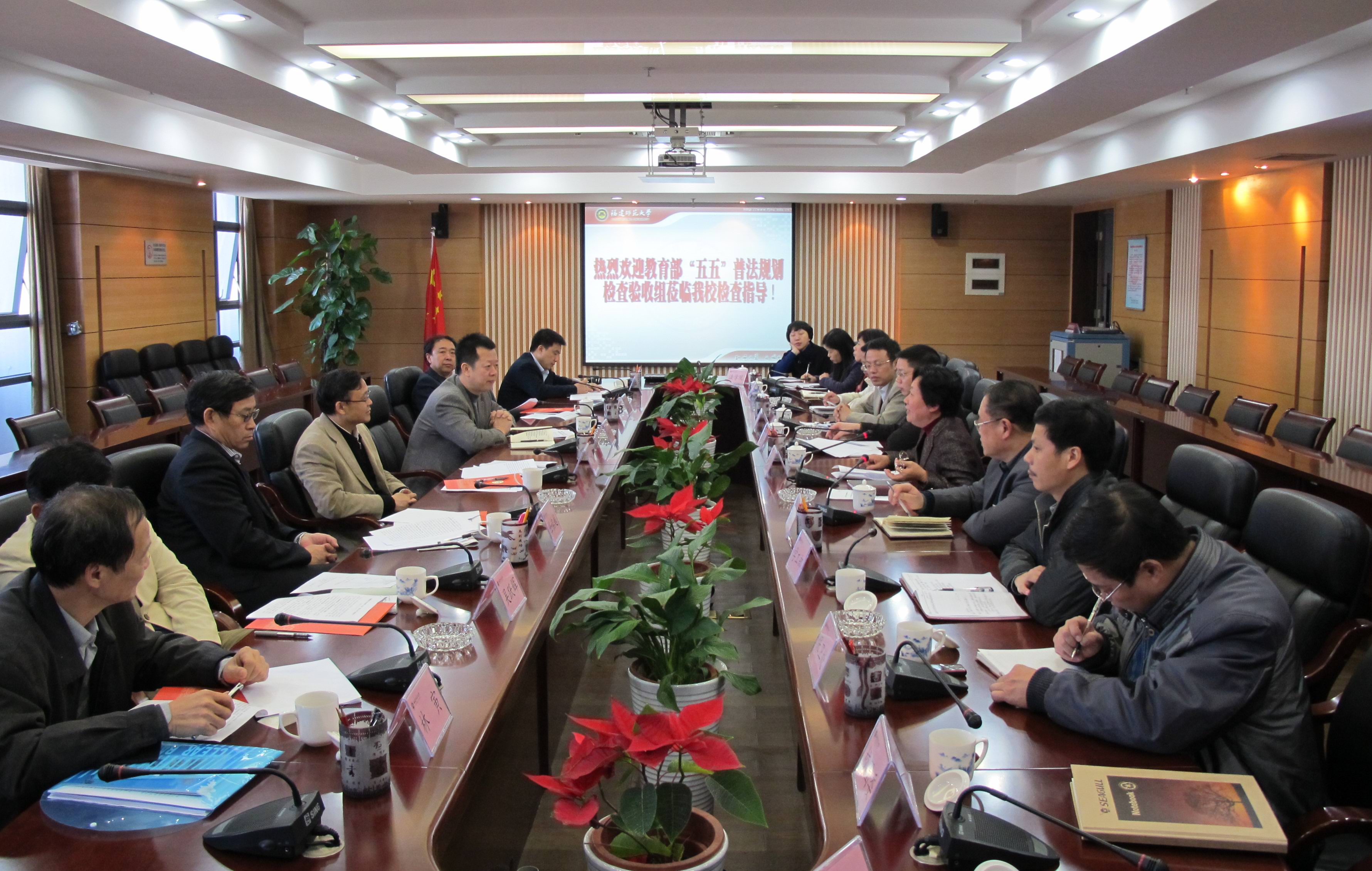 12月9日上午,以教育部法制办公室(全国教育系统普法领导小组办公室)副主任王家勤为组长的“五五”普法检查验收组一行5人,莅临U8·电子(中国)官方网站检查指导工作。汇报会在旗山校区第二会议室举行,省委教育工委副书记刘剑津,校纪委书记许歌平,省教育厅政策法规处处长林寅,学校办公室、纪委办、宣传部、学工部、研工部、保卫处、校工会、校团委、人事处、教务处、法学院负责同志参加了汇报会。