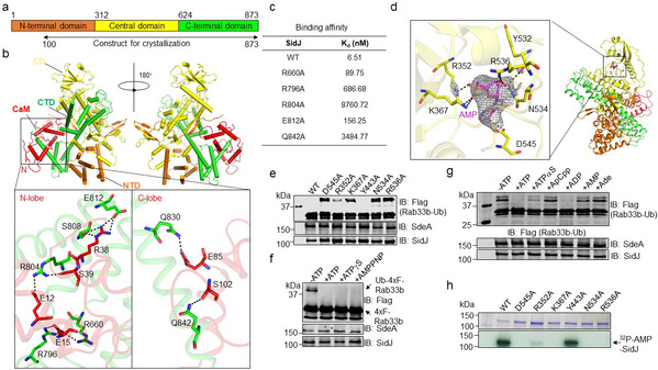 该研究发现了致病性嗜肺军团菌(Legionella pneumophila)效应蛋白SidJ可以被宿主体内的一个钙调蛋白CaM结合并激活,进而通过谷氨酸化修饰(Glutamylation)抑制SidE家族泛素连接酶活性的分子机理。该工作详细解析了致病性嗜肺军团菌效应蛋白SidJ调控SidE酶活性的分子机制,为探讨谷氨酸修饰酶(glutamylase)的催化机制提供了新的体系,也为临床治疗嗜肺军团菌感染的药物开发提供了新靶点。