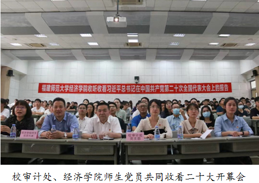 校审计处党员干部和经济学院师生在旗山校区知明2-102共同收看习近平总书记在中国共产党第二十次全国代表大会上的报告。经济学院党政班子成员、中心组成员、科级干部、师生党员、2019级财务管理本科生党支部全体党员、第36期入党积极分子培训班学员等共260余人参加了活动。