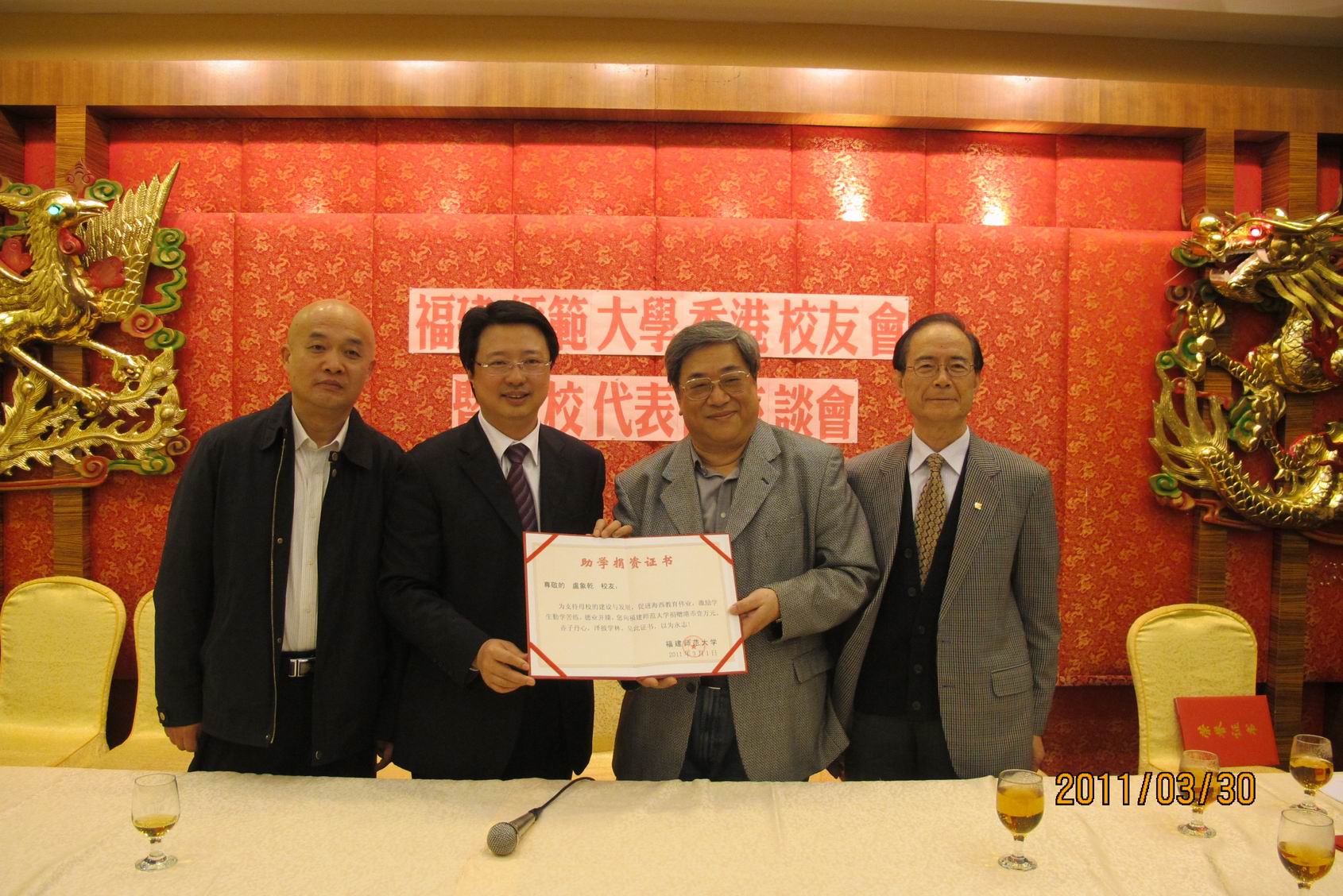 香港校友会倡议成立扶助贫困新生的扶贫基金,目前已有吕振万、吴维新、林民盾、黄碧云、杨海、卢象乾、李祖泽、李敏、曾清映、叶培辉、王钟汉、施秀椰、陶昭福等13位校友,分别向母校贫困学生捐助1万港币。黄校长代表母校为他们颁发了捐赠证书。