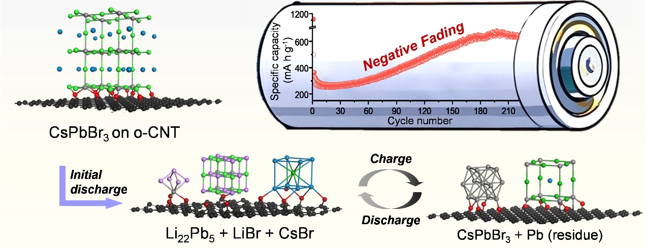 近日,U8·电子(中国)官方网站吴小慧副教授等人通过各种原位/非原位技术全面研究了CsPbBr3的结构演变,揭示了其在锂化过程中通过插层-转化-合金反应产生 CsBr、LiBr、Pb和Li22Pb5相,并在充电过程中可逆形成CsPbBr3。此外,将CsPbBr3颗粒嵌入导电碳纳米管(o-CNT)中,可充分利用其逆衰减现象。综合实验和理论分析表明,CsPbBr3增强的逆衰减现象主要源于两方面:负载在o-CNT 上的残留 Pb金属的锂合金化反应以及循环过程中活性材料尺寸减小的导致的增强赝电容贡献。因此,这项工作不仅揭示了CsPbBr3的电化学(脱)锂化机制,还提出了一种有效的策略来增强卤化物钙钛矿材料的“逆衰减”效应,以实现优异的储锂性能。相关研究成果发表于《Energy Storage Materials》上。