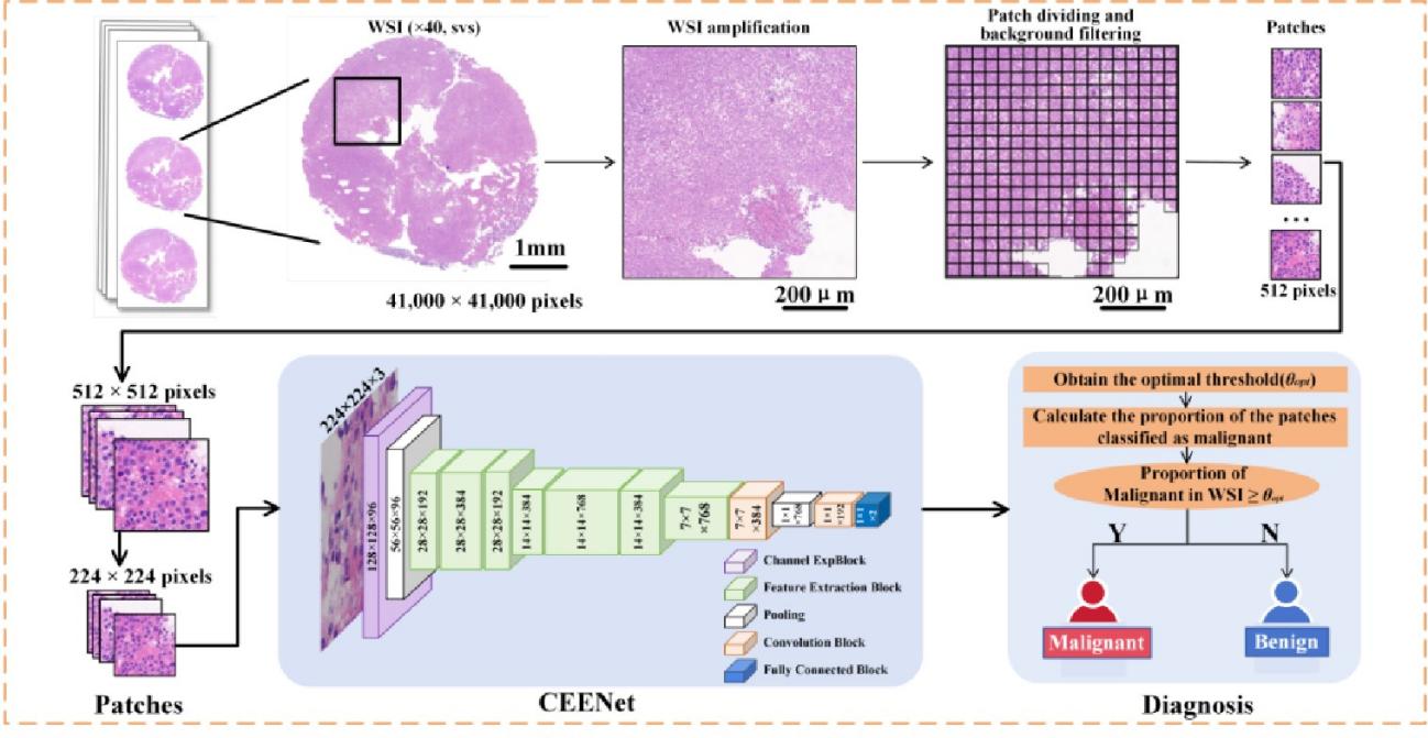 近日,U8·电子(中国)官方网站王琨副教授、杨洪钦教授与福建医科大学附属第一医院曾赛凡主任合作,提出一种基于多实例学习的弱监督深度学习模型CEENet,并首次将细胞蜡块技术与深度学习模型结合用于筛查浆膜腔积液中的腺癌。结果表明,所提出的模型不仅在弱监督下实现了先进的性能,同时平衡了可学习参数的数量和计算成本,减少了病理医生的工作量,而且在浆液性腺癌细胞病理应用场景下模型表现出了很强的可解释性和泛化能力。该模型性能和特点表明其在浆膜腔积液快速筛查和诊断中的有效性,及其在临床及精准医疗中的广泛应用前景。相关研究成果发表于《Modern Pathology》上。