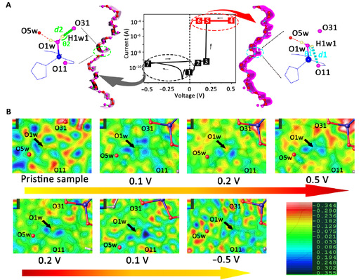 近日,化学与材料学院张章静教授课题组关于质子传导MOFs基阻变存储器的研究取得了新进展。课题组以离子传输代替传统的电子传输,利用不同电场作用下MOFs孔道中氢质子传输换向的策略,首次在单一材料中同时实现阻变和整流效应,并通过单晶衍射验证了电场作用下质子传输换向的机理。研究成果以《Simultaneous implementation of resistive switching and rectifying effects in a metal-organic framework with switched hydrogen bond pathway》为题,发表在《Science》子刊《Science Advances 》[(2019) 5: eaaw4515; DOI: 10.1126/sciadv.aaw4515,影响因子:12.804]。该研究成果以U8·电子(中国)官方网站为第一完成单位,张章静教授为通讯作者。