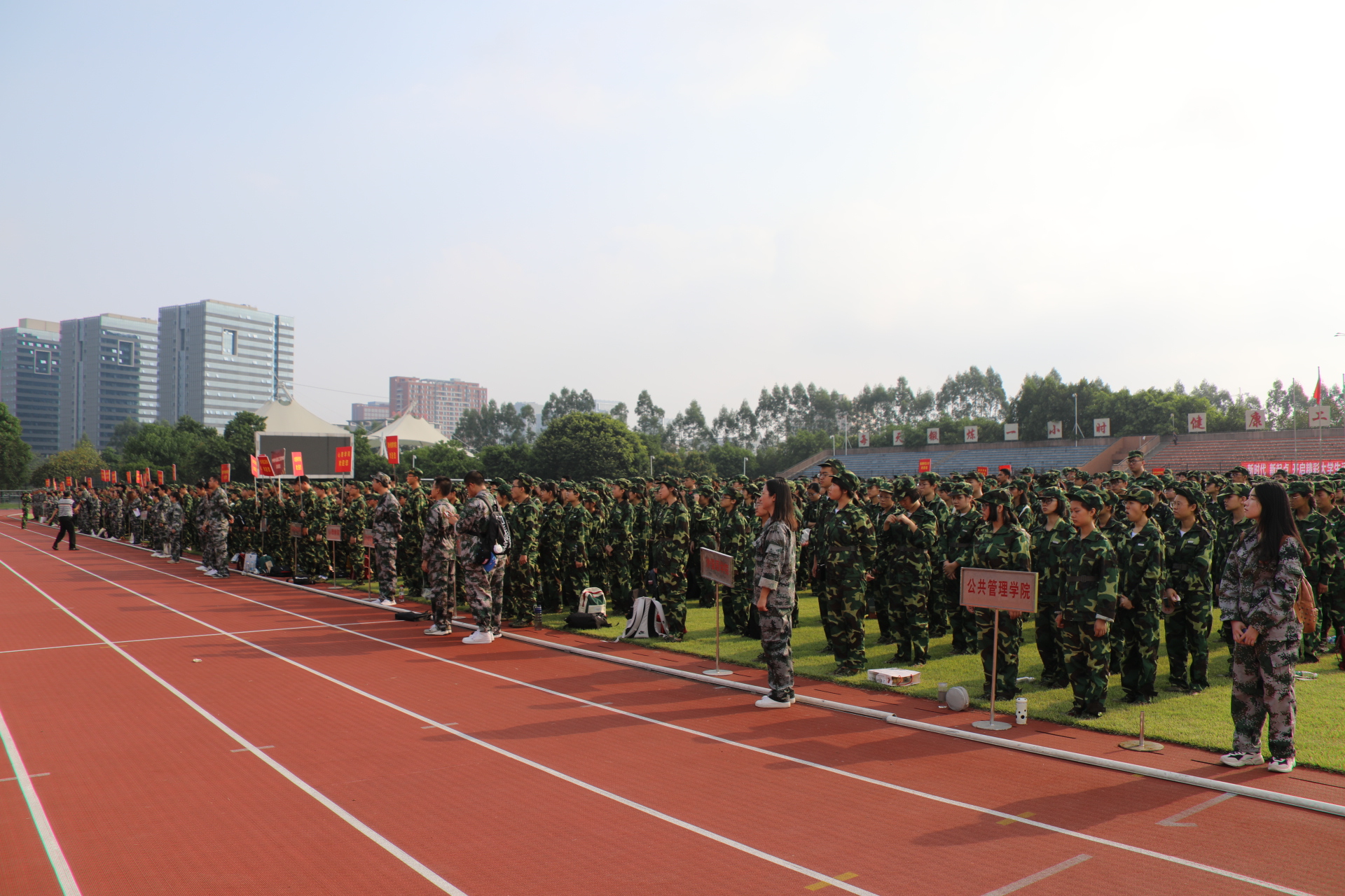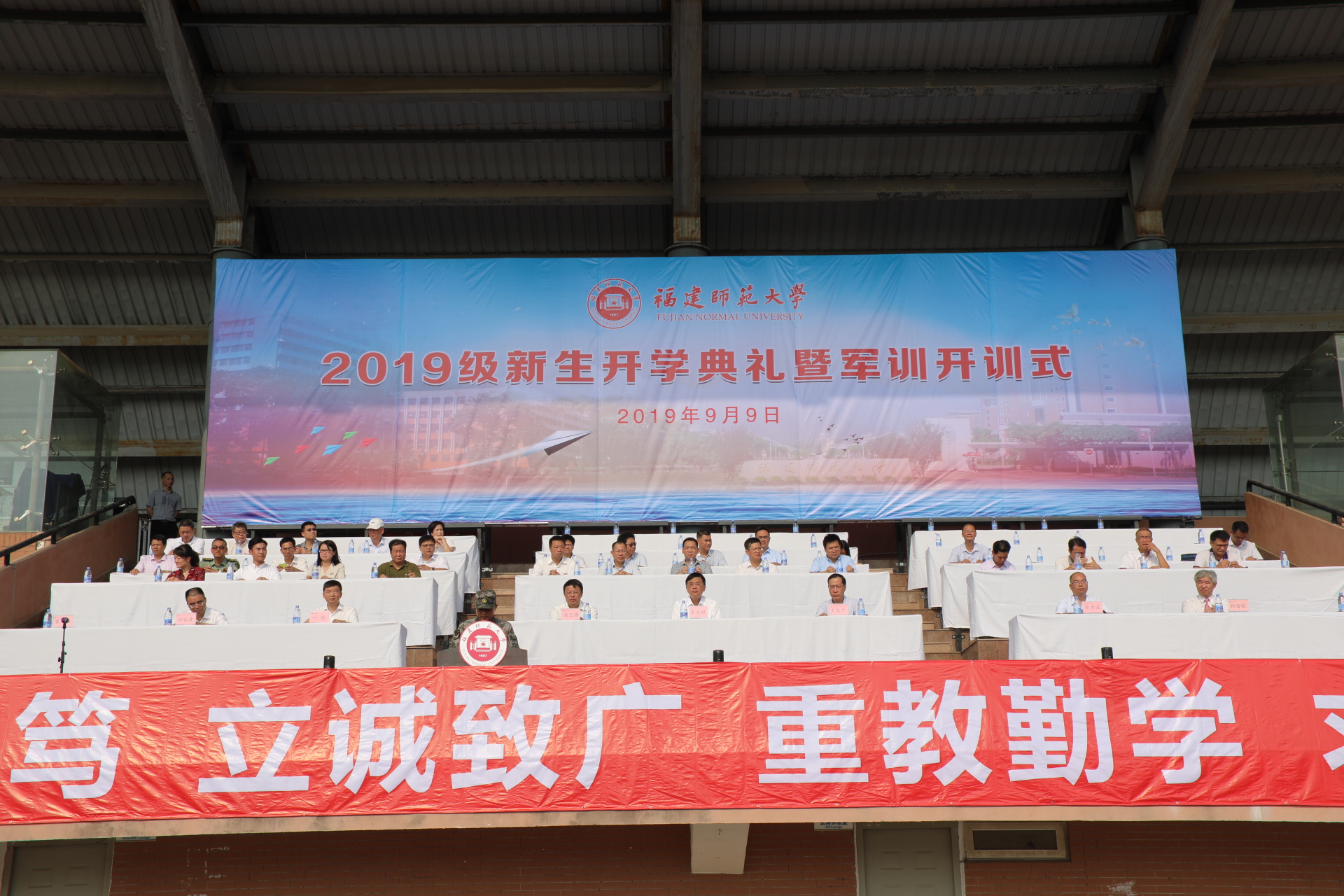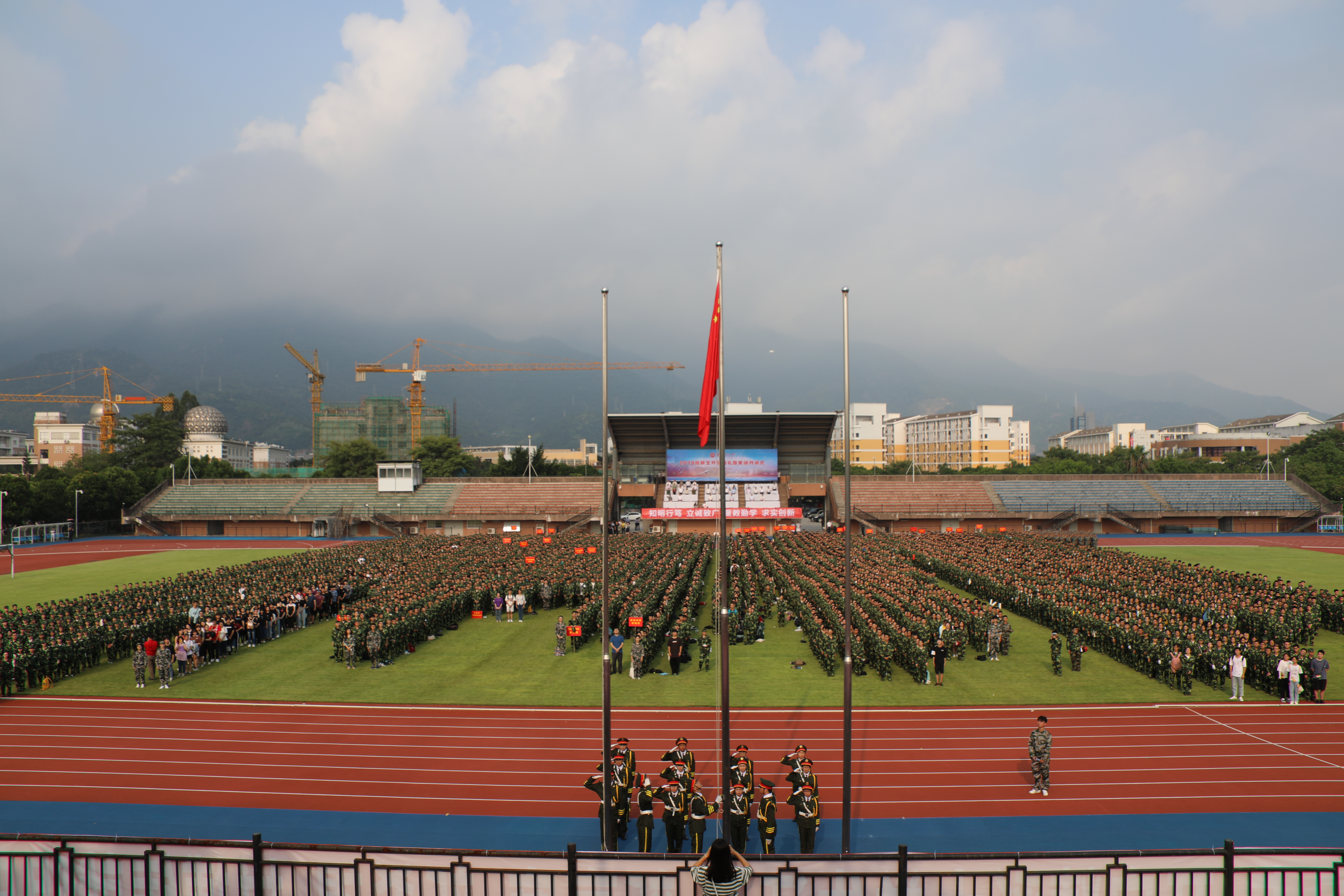 开学典礼上,军训团团长黄延权中校、马克思主义学院陈新星副教授、传播学院史祺桢同学、海外教育学院郑杰婧同学分别发言。典礼结束后,全体新生在军训教官的带领下,将进行为期2周的军训活动。
