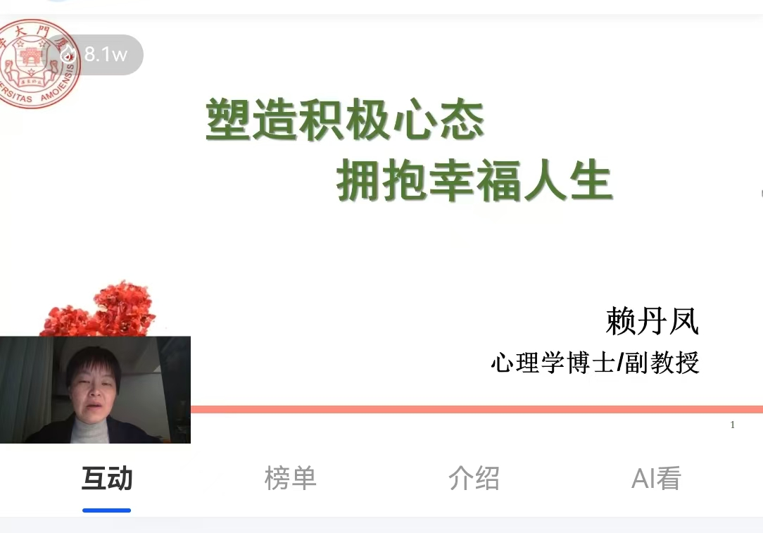 为了引导广大学生更好适应新学期新生活,2月16日晚,学工部特邀厦门大学心理咨询与教育中心主任赖丹凤副教授做客“清心源”讲坛第四期直播间,开展题为“塑造积极心态 拥抱幸福人生”的讲座。