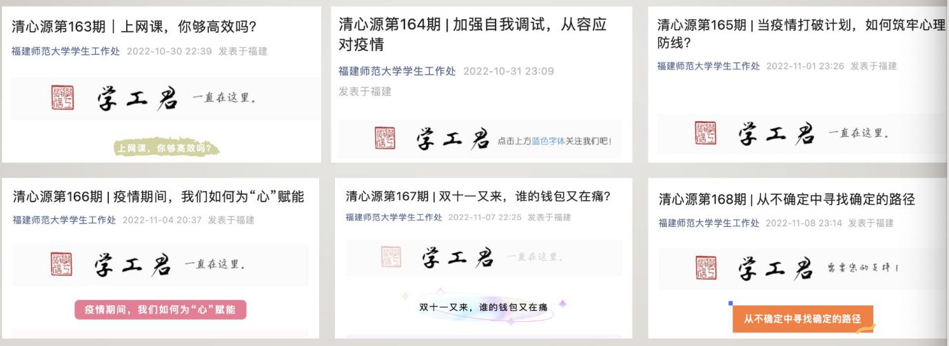 一是心理健康“云服务”不断线。迅速开通在线心理支持服务,组织专兼职心理咨询师,为学生提供线上心理咨询服务。本次疫情发生以来,通过线上线下咨询服务人数已超过500人次。同时,定期通过官方微信公众平台“清心源”、“心电台”专栏推送高质量心理防疫主题原创科普内容,指导在校学生规律作息、合理认知、积极适应网课学习模式。同时,各学院也通过各种方式共同纷纷加强学生心理疏导工作。例如,社会历史学院开通“学姐小树洞”,经济学院建立“心理小窝”,传播学院开设“心理驿站”等,通过多种方式为学生提供温暖、安全的倾诉途径,积极主动为学生排忧解难。
