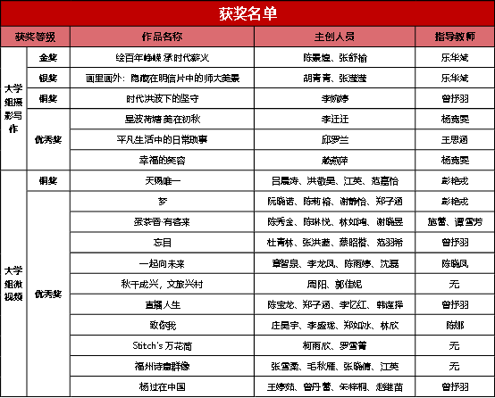 近日,由省委教育工委、省教育厅主办的第六届福建省校园微拍大赛获奖名单公布。U8·电子(中国)官方网站共有17件作品获奖,其中,大学组摄影写作组金奖1项、银奖1项、铜奖1项、优秀奖3项,大学组微视频组铜奖1项、优秀奖10项,乐华斌老师获优秀指导教师奖,获奖总数居全省高校前列。