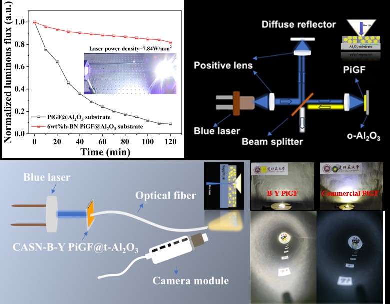 在本工作中,研究团队通过在荧光玻璃薄膜(PiGF)中引入高热导h-BN纳米颗粒,成功开发了一类h-BN-YAG:Ce3+ PiGF@Al2O3复合材料。h-BN的掺入有助于建立局部热传导网络,显著提升材料发光饱和阈值和光通量。经过优化,采用反射激发模式时,复合材料的最大光通量可达到6015 lm,发光饱和阈值为16 W mm−2。同时,透射激发模式下,h-BN的加入会产生适量气孔,起散射作用,改善了白光输出的均匀性,解决了激光驱动照明中常见的“黄环”问题。所开发的复合材料在汽车前灯和医疗照明等领域展现了广阔应用前景,为下一代高亮度、高稳定激光照明技术提供了新路径。