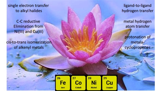 炔烃的选择性氢官能团化和双官能团化在精准构筑多取代烯烃中具有重要作用。长期以来,贵金属(如钯、钌、铱和铑)配合物在炔烃的催化转化中应用广泛,例如钌催化的烯-炔偶联反应已成为天然产物全合成中生成1,4-二烯结构单元的关键步骤。相比之下,第一过渡系金属具有较小的原子半径,较低能量的3d 轨道以及较低的Pauli电负性值,因此在催化反应中通常表现出有异于贵金属的反应性。同时,铁、钴、镍和铜等第一过渡系金属在地壳中储量丰富,以其代替贵金属可促进可持续发展,并提升工业生产的经济效益。