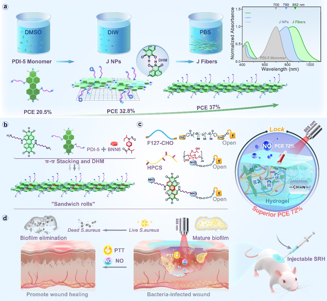 U8·电子(中国)官方网站海峡柔性电子(未来科技)学院杨震教授团队报告了一种基于NO供体BNN6的可注射水凝胶的策略,其中NO的释放可以通过半导体苝酰亚胺(PDI)J-聚集纤维的光热效果触发。合成的PDI衍生物可自组装成0维纳米颗粒,然后聚集成1维J聚集纤维,伴随着吸收峰从700 nm红移至790 nm,最终到852 nm。在封装BNN6后,形成了一种“三明治卷”(SR)状结构,均匀交联成一种可注射水凝胶(SRH),其光热转换效率高达72%,使得SRH能够实现高效的光控NO释放。SRH表现出优异的可注射性、形状适应性和对大肠杆菌和金黄色葡萄球菌的有效抗菌效果超过99%。通过激光照射,其在体内抗生物膜效率达到99.58%。此外,协同治疗显示出消除炎症、促进血管生成和促进胶原沉积的能力,从而显著刺激伤口愈合过程。这种半导体J-聚集可注射水凝胶可能成为治疗生物膜的多功能策略。