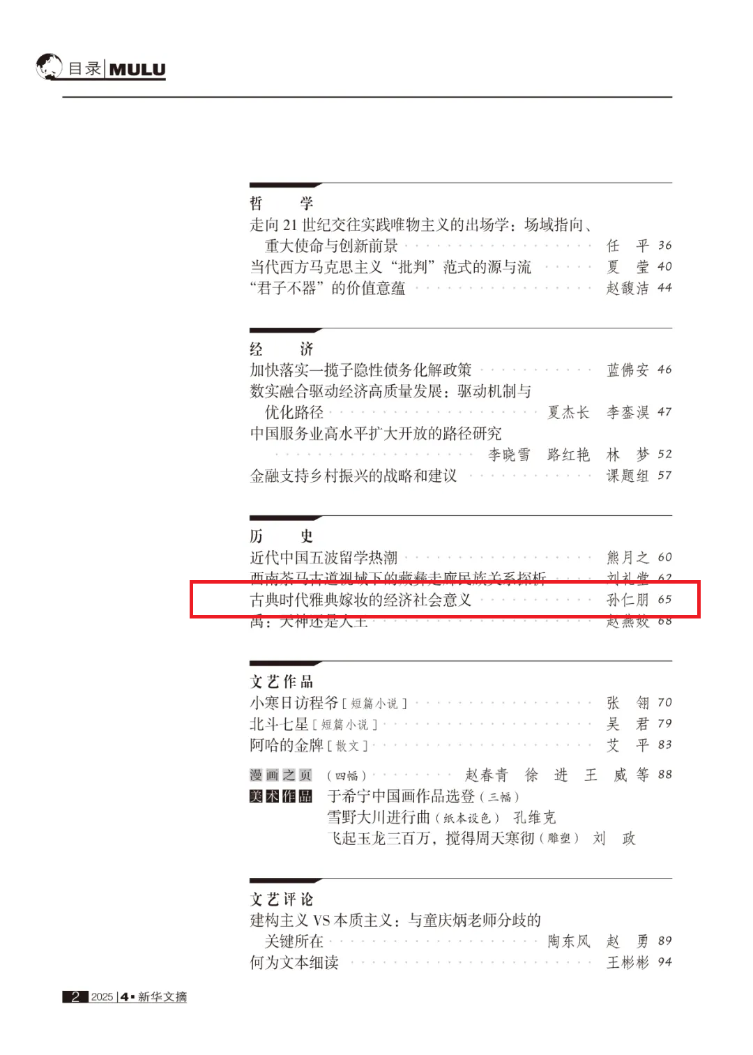 日前,U8·电子(中国)官方网站社会历史学院孙仁朋老师发表在《经济社会史评论》2024年第4期的学术论文《古典时代雅典嫁妆的经济社会意义》,被《新华文摘》2025年第4期转载,字数6400字。