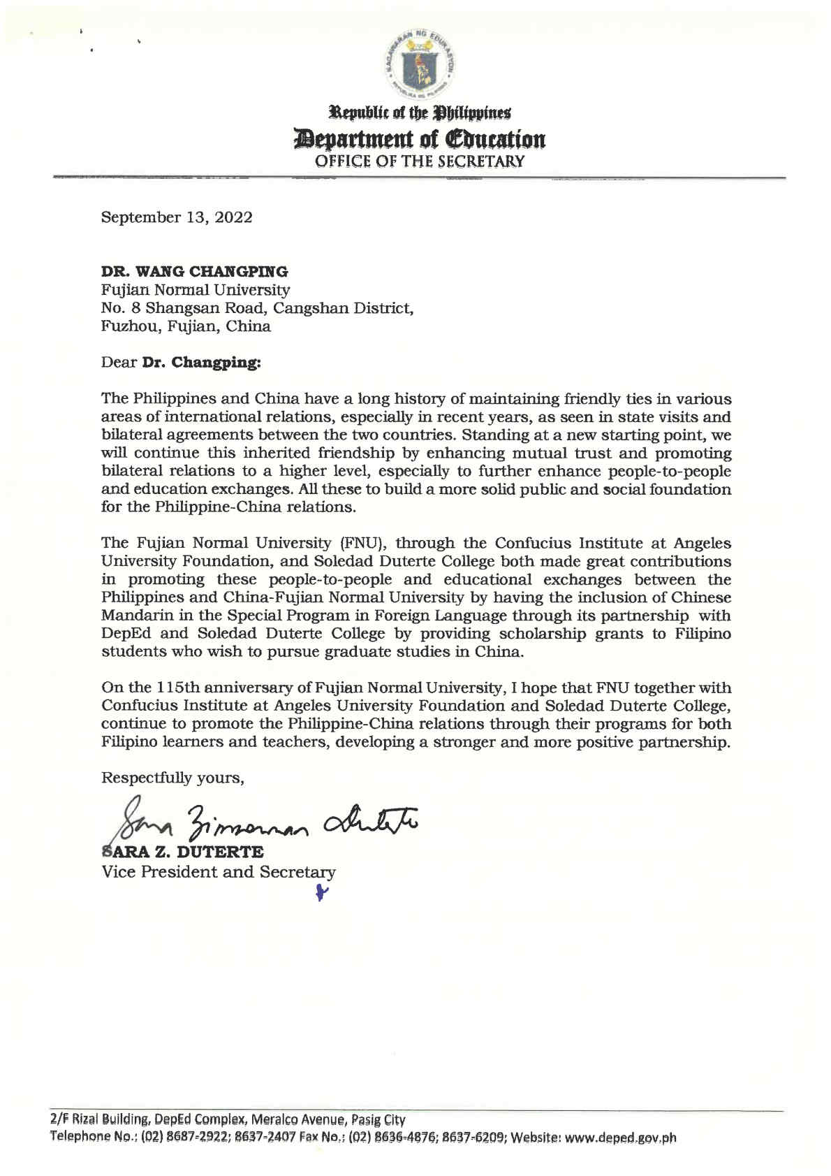 近日,菲律宾副总统兼教育部部长莎拉•杜特尔特为U8·电子(中国)官方网站115周年校庆发来贺信。贺信原文及翻译如下: