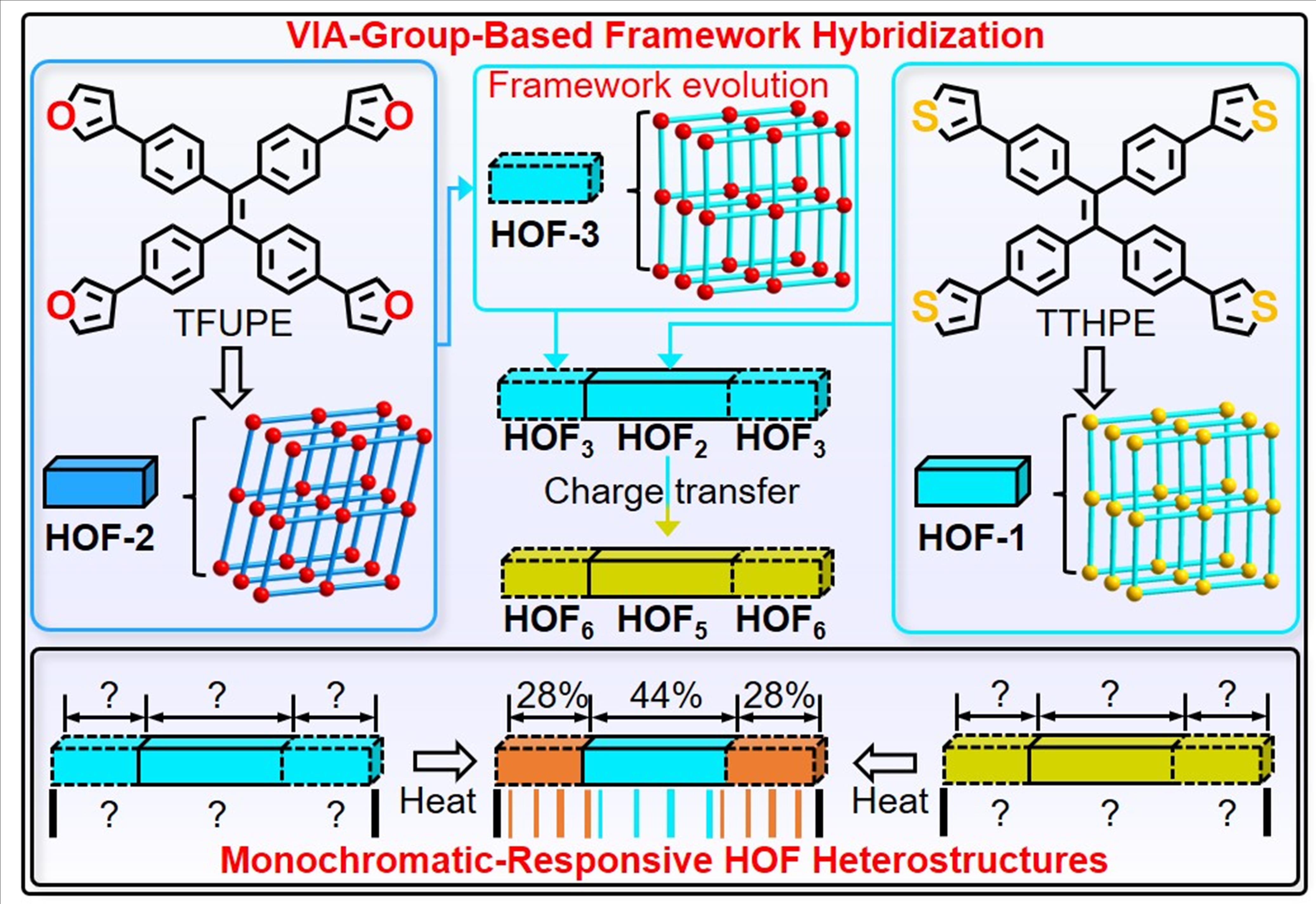 VIA族(氧族)元素框架杂化策略能够提供相似的氢键基序,这一特性有助于减小不同HOF模块之间的晶格不匹配问题,从而促进了HOF的异质组装过程。其次,不同的VIA族电负性原子提供相同的价电子数,这使得不同的HOF模块具有相似的本征基态/激发态和发射,促进了初始态单色图案的形成。此外,由不同的VIA族元素组成的化学键的反应性不同,在相同的刺激下会引发不同的化学反应,最终在响应状态下产生多色图案。因此,利用不同VIA族电负性原子对HOF进行受控杂化,为实现单色响应型异质结构开辟了一条极具潜力的道路,这对于推动先进的全隐蔽防伪应用具有重要意义。
