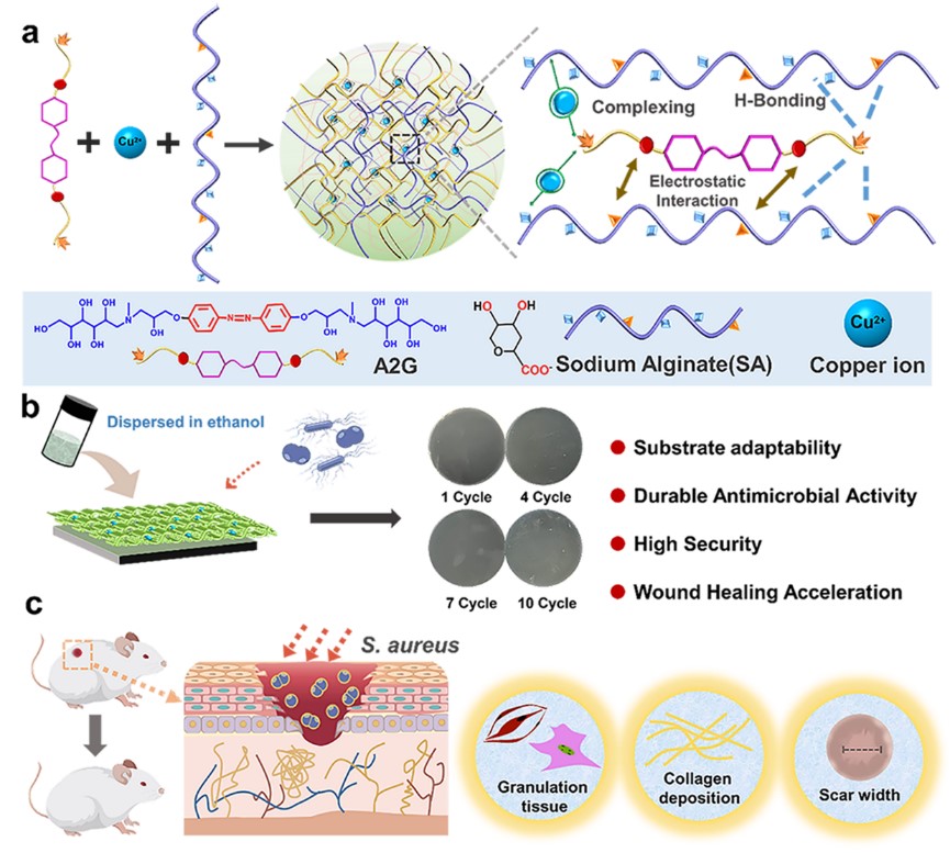 研究团队开创性地采用了异基元聚离子组装策略,以天然海藻酸钠(SA)作为智能载体,巧妙地将A2G抗菌小分子与Cu²+结合,形成聚离子结,最终表现为不溶于水的超分子沉淀。这种材料通过精密的氢键网络、静电相互作用及疏水效应,构建出锯齿状纤维密织结构,从而实现了抗菌活性成分的程序化控制释放。A2G-Cu-SA超分子沉淀材料对金黄色葡萄球菌、大肠杆菌、白色念珠菌等常见病原体均展现出卓越的持久抗菌活性,即便经过多次水洗循环,对金黄色葡萄球菌的灭活率仍高达99.9%。更为引人注目的是,该材料能够牢固地附着在各种不同材质的基底表面。经过实验室高粘性胶带100次剥离及长达100天的水浸实验,其抗菌活性依然保持在99.9%以上,创下了同类材料耐久性的新纪录。体外和体内实验均证实,A2G-Cu-SA在杀灭病原体方面具有高度选择性,且不产生任何毒性。此外,它还能有效加速细菌感染伤口的愈合,减少炎症反应,并促进血管生成。这种集高效性、耐久性和生物相容性于一体的理想材料,无疑为满足全球日益增长的抗感染需求提供了强有力的支持。