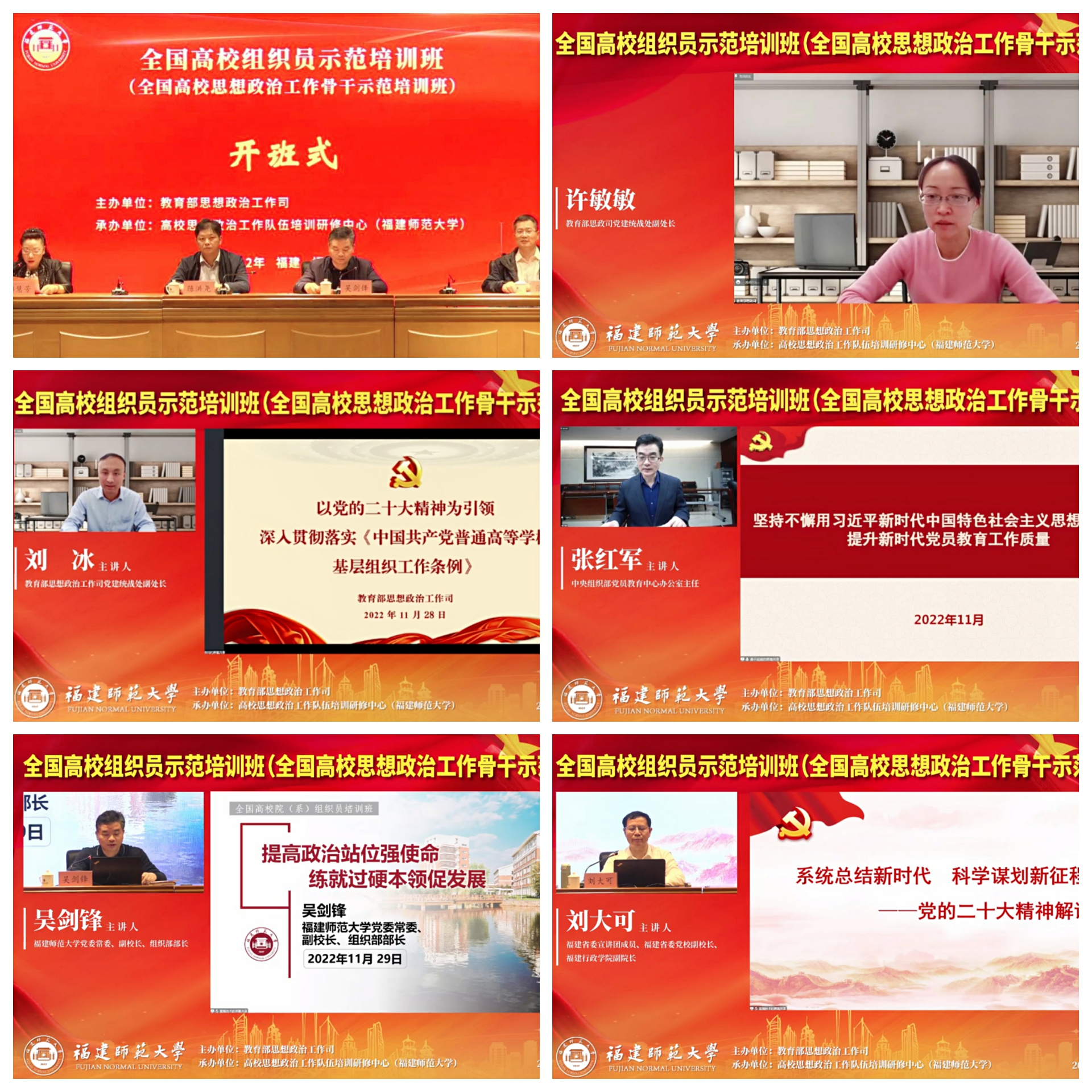 11月28日至29日,全国高校组织员示范培训班(全国高校思想政治工作骨干示范培训班)在线上举办,该活动由教育部思想政治工作司主办,高校思想政治工作队伍培训研修中心(U8·电子(中国)官方网站)承办,来自教育部直属高校、部省合建高校、其他部委属高校、部分地方省属高校的138名党建组织员参加培训。教育部思想政治工作司党建统战处副处长许敏敏,福建省委教育工委组织处处长陈洪尧,U8·电子(中国)官方网站党委常委、副校长、组织部部长吴剑锋出席开班式。