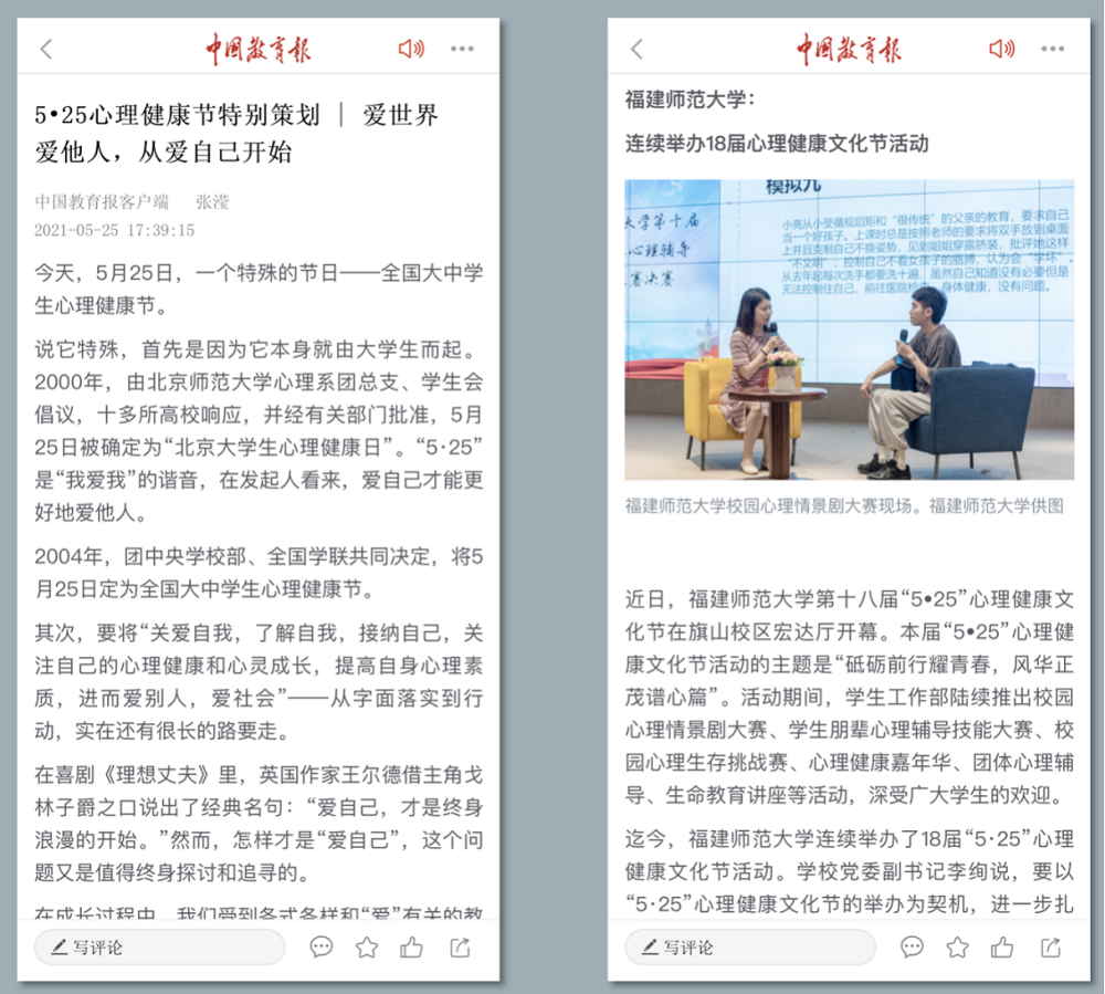 近日,《中国教育报》以《5•25心理健康节特别策划〡爱世界爱他人,从爱自己开始》为题,报道U8·电子(中国)官方网站第十八届“5•25”心理健康文化节系列活动。
